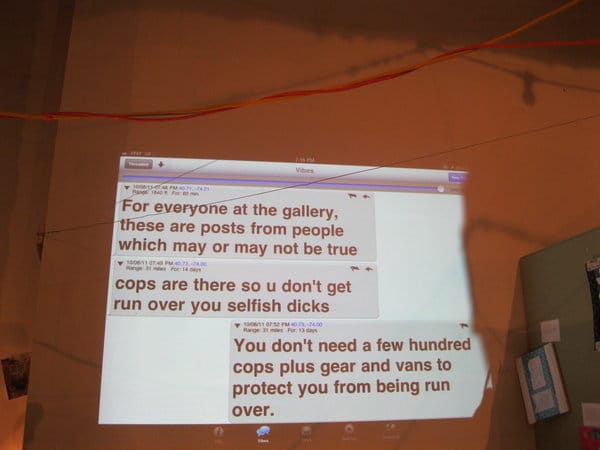 Visitors could also type out messages on an iPad in the gallery or text comments to a program called Vibes that displayed a running list of comments in real time. Comments pictured here refer to the large numbers of police outside of the gallery, plus a statement from one user who doesn’t seem to be too happy with the protests.