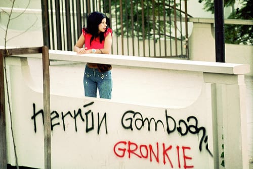 In addition to tagging walls, Asco also did performances, usually in public, such as “Instant Mural” (1972). A take on traditional Chicano muralism in LA, Gronk taped Patssi Valdez and Humberto Sandoval to a wall. Even though its pretty literal, Asco made a mural out of the actual bodies that would be represented in the murals scattered among Los Angeles. Forcing the general public to confront the Chicano body, Asco again deftly merged art and politics.