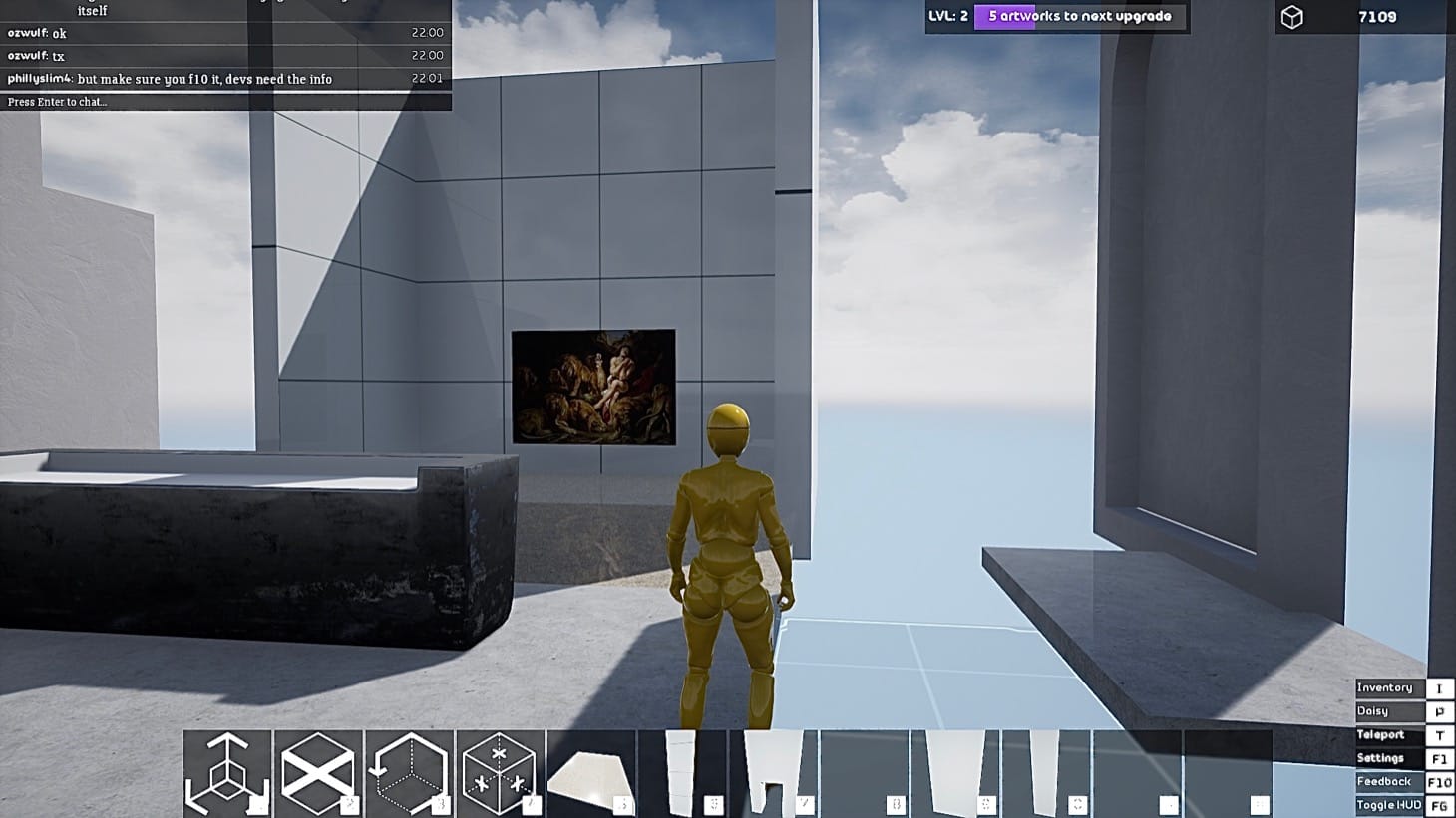 My fledgling sky gallery has become kind of boring, so I decide it’s time to leave and go see what other players have created. My digital character can teleport to other galleries on the game’s server, so I try out the gallery of a user named bloodbomb. After a few seconds, I arrive in a much bigger, and more decked-out space that’s reminiscent of Chinese billionaire Liu Yiqian’s One 57 condo.