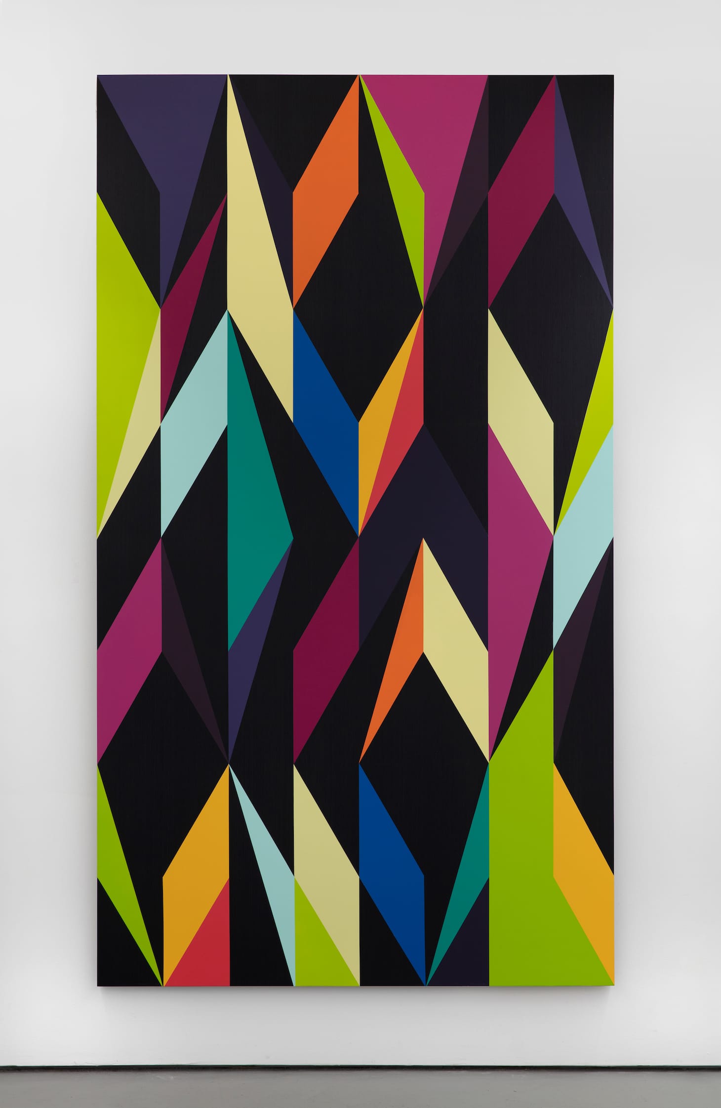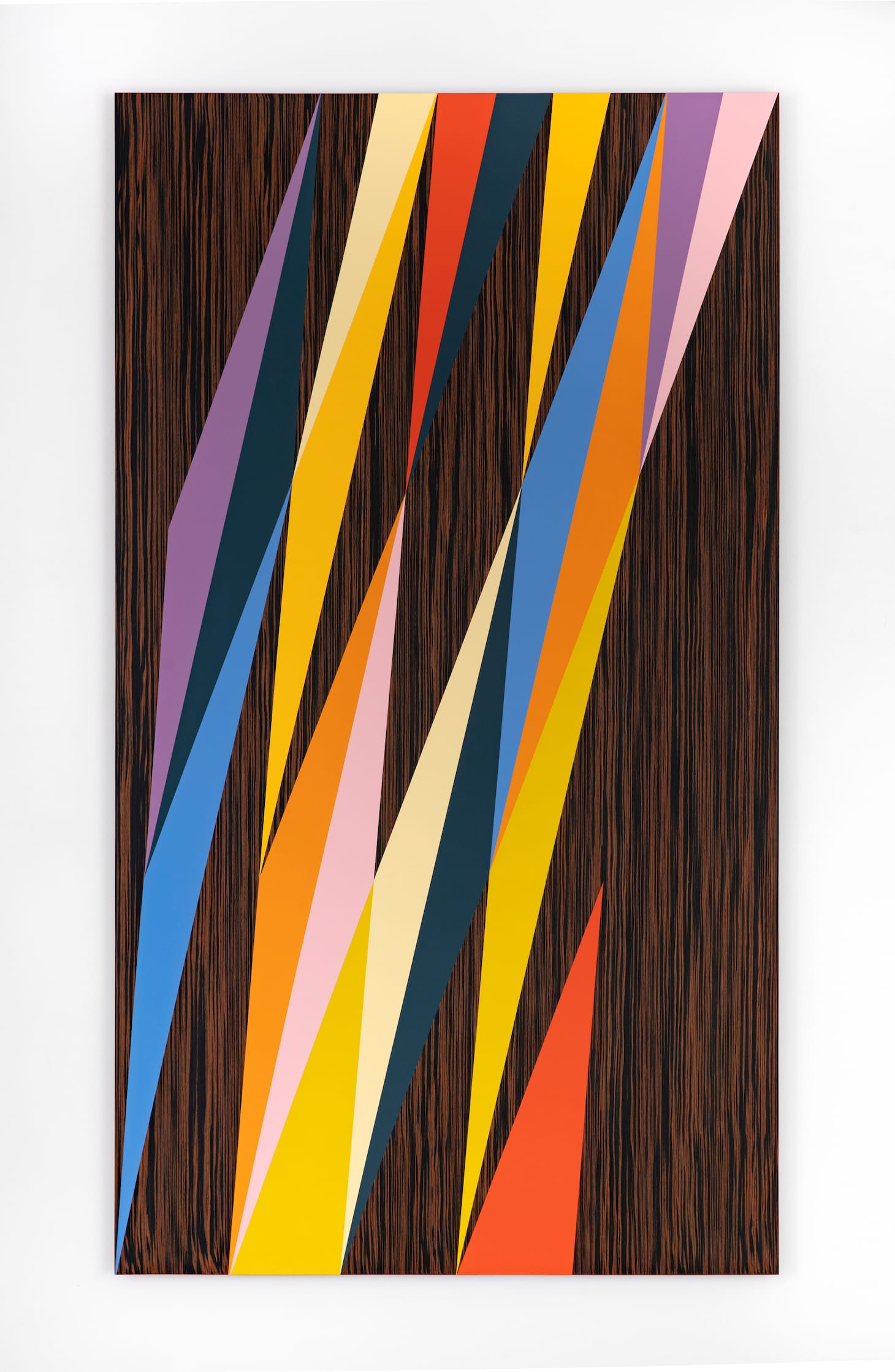 In “Dark Angel” (2020), Odita overlays a black wood veneer ground with two bands of equal width spanning the painting from its top to bottom edge. The placing of the bands gives the black veneer, with its whitish striations, equal prominence. Each band is divided into sharply tapering scalene triangles, all of which are painted a different color. The edge of the band’s tightly painted skin presses up against the wood veneer’s textured surface.