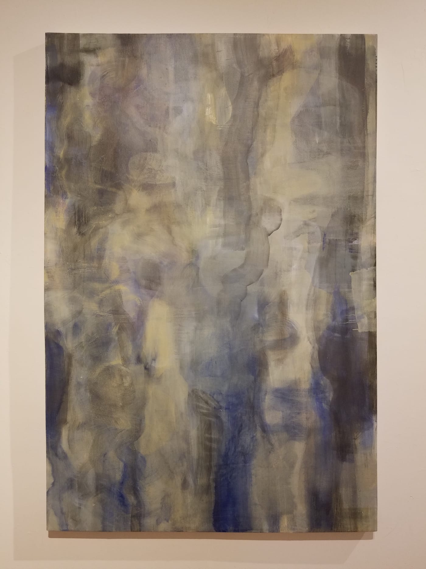 All good. But the psychic conditioning provided by Guillot’s body-centric, strangely furtive imagination predisposes the viewer (this viewer, at least) to notice a figural or even visceral undertow in the soft-edged, oozing shapes in Gold’s abstractions. Their very indistinctness takes on a sense of incipience. Elongated brush strokes slither up the canvas like enormous snakes in the ghostly “Silvery Shadows” (all works by Gold are dated 2016), and the surface as a whole takes on the visual texture of a membrane, or of an X-ray image of internal organs.