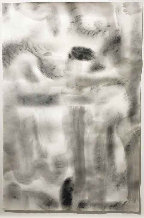 There is one drawing in Gold’s show, and what a drawing it is. Melting, convoluted bands of gray belly around and elbow their way into the shallow, frontal space, in places gaining an illusion of nearly tubular volume. The ink is here a pale wash, there a blackish smudge, and in between, a film like smoke or dust. Interstices of untouched (or barely touched) paper send a shimmer through the drawing’s shadows. The nuances of tone Gold achieves are exquisite, trading on the equivalence in value of a brush heavy with thinned, watery ink, and stronger, darker ink on a drier brush that leaves a raspy trace. Such a hybrid of techniques is difficult to control, and in this drawing Gold nails it.