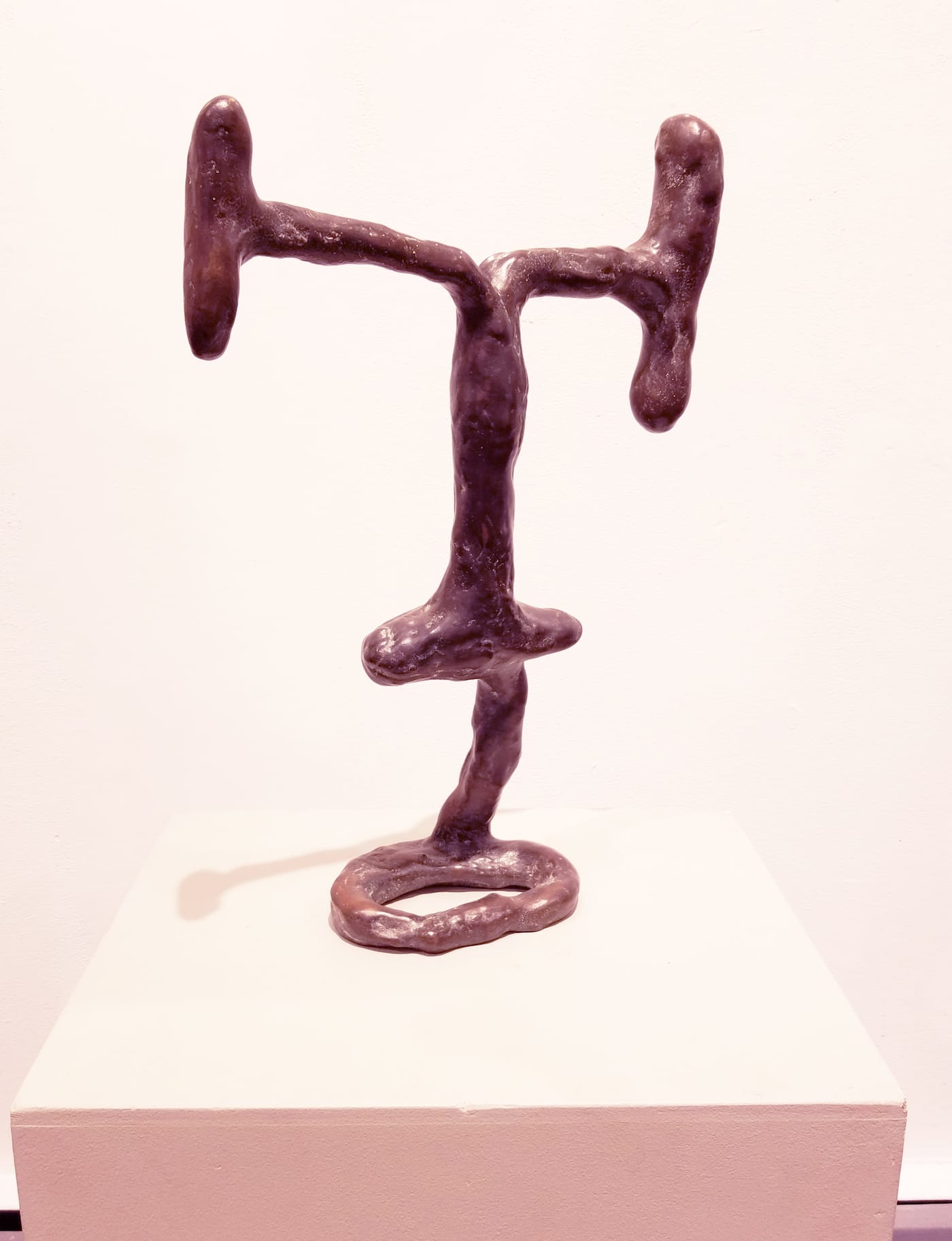 In a reciprocal manner, and in light of Gold’s observance of painting’s fundamental assumptions, Guillot’s previously unnoticed normativity appears. After all, he uses a lot of conventional materials and methods, even casting in bronze the obliquely, spookily face-like “Afterimage” (2015) — which, incidentally, might attune a gallery visitor to the pareidolic potential (imagining a face or figure in random shapes) of Gold’s paintings. As noted, his methods also include modeling on wire armatures, and I wouldn’t be surprised if there is even some carving going on here. As sculptors have been for ages, Guillot is attentive to the relationship between the art object and the base (or other means of support); in this show, he tries just about all the options: floor, pedestal, table, shelf, suspension in space.