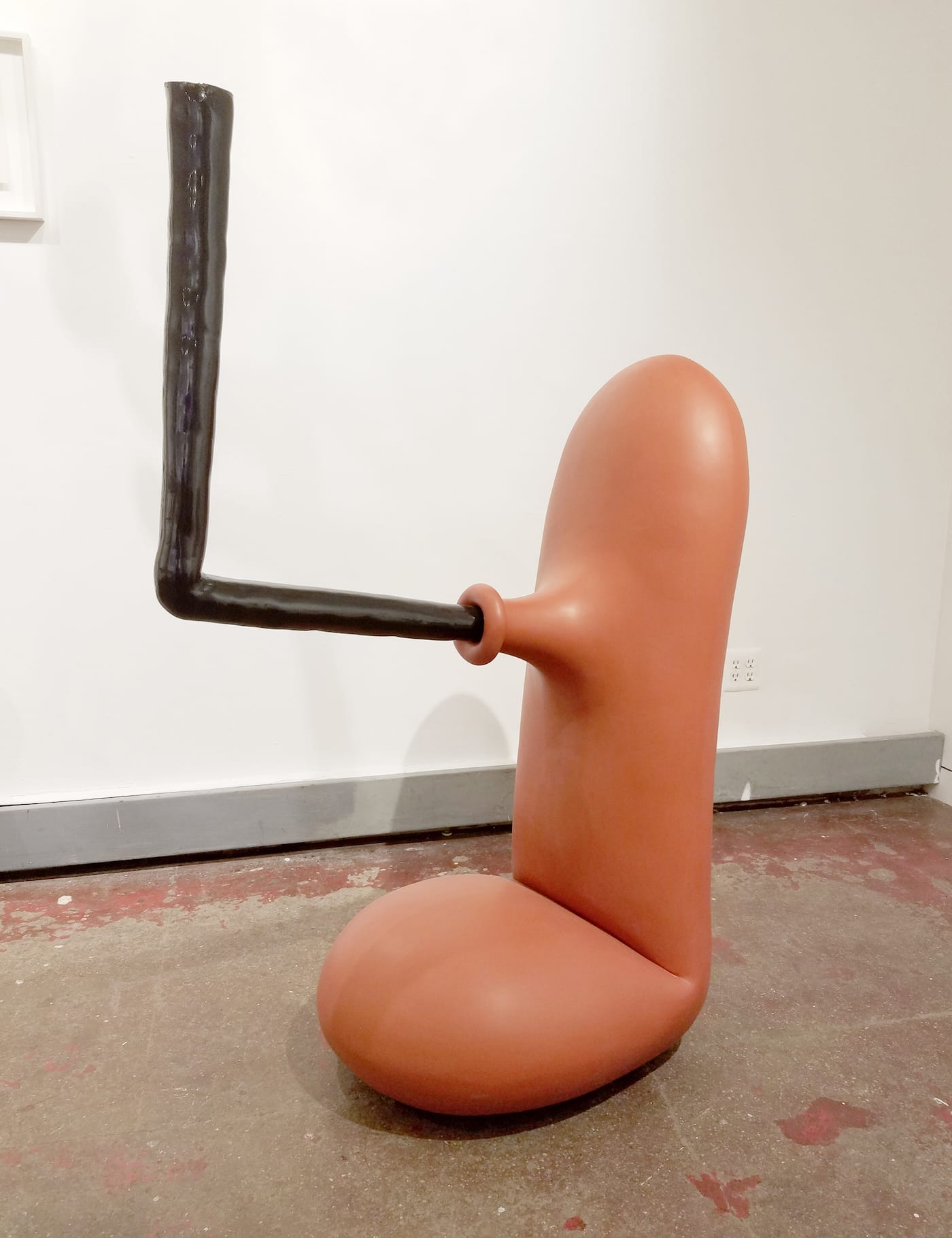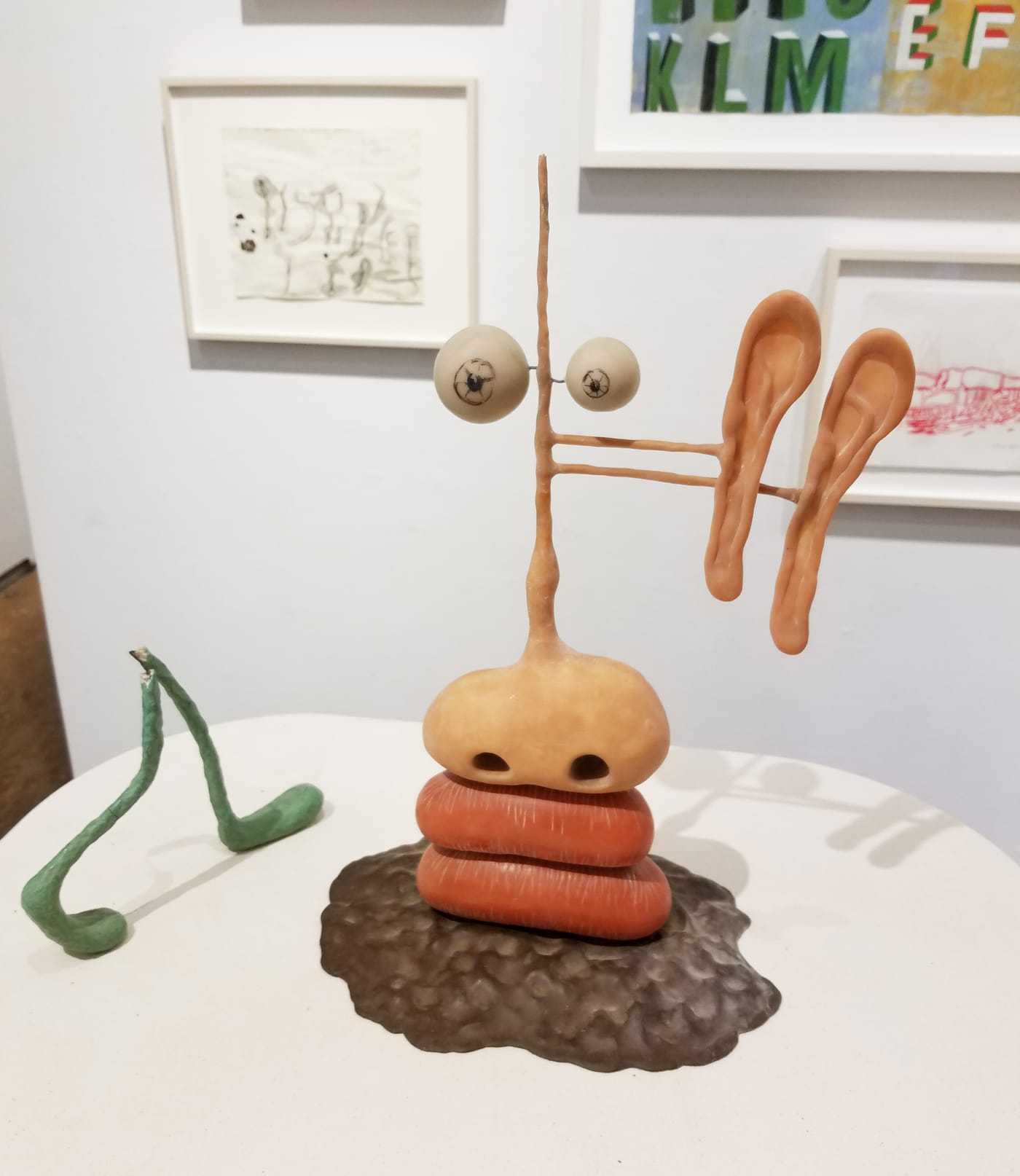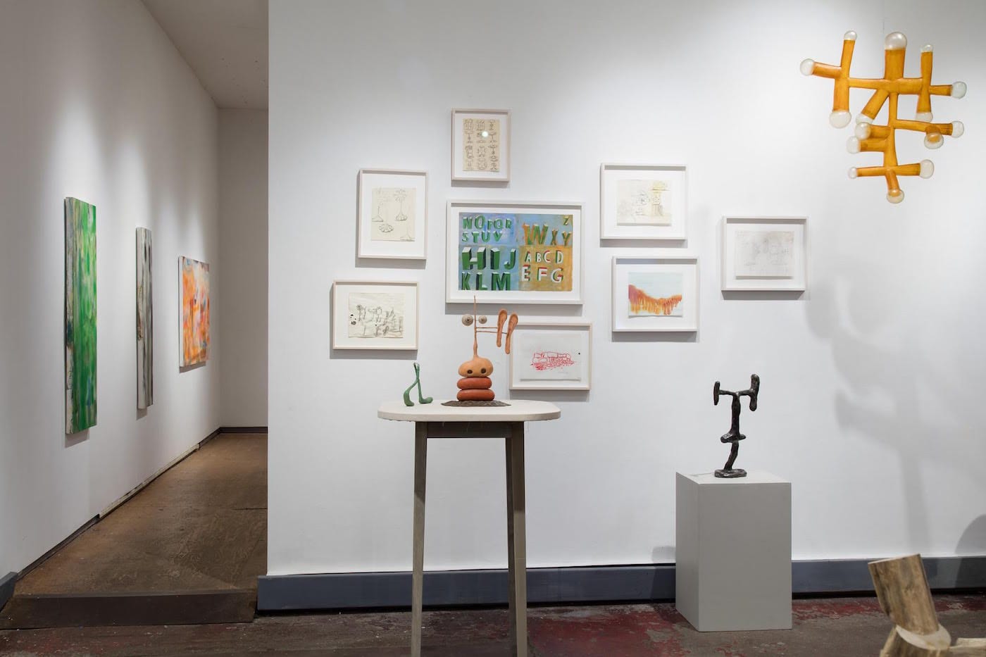 Impressively multifarious, Guillot’s work occupies floor space, wall space, table space and air space in the gallery’s front room. “Fast Food” (2014) sits on the floor, and looks rather like a hot dog sitting upright and trying to suck something out of a bent section of a conduit. Hanging from the ceiling by a thin wire is “Untitled (bubble tubes)” (2015), a bristling lattice of translucent amber cylinders with milky-looking bubbles the size of softballs at the ends. It looks vaguely visceral, and in fact anthropomorphism creeps through the entire show, emerging at times into the openly figurative: a few lumps of tinted polymer clay for eyes, ears, nose and lips (and beard, I think) constitute “Stack Face” (1998), along with the wire armature that sorts those features in space. It shares a pedestal with an unidentified work, a little pair of loping legs made of clay or maybe cement over wire. Odd as it is to spotlight in this way a work that does not appear on the checklist, that decision is of a piece with the show’s loose-limbed attitude.