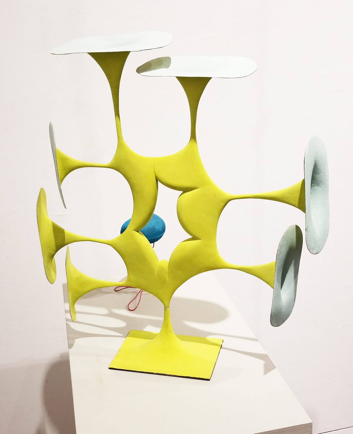 I’d describe the exhibition as “quirky,” but then we all have our quirks, don’t we? It seems likely that Guillot has looked hard at Philip Guston and Robert Crumb. A stunning, pedestal-based work, “Untitled (ST4)” brings the Dr. Seuss: from a central void resembling a cartoon explosion, protrusions resembling both trumpets and ears blast up and out. The lurid greenish-yellow of its outer surface (inside, the gaping orifices are white) makes you realize that, by comparison, a relatively restrained palette is the rule for Guillot’s work.