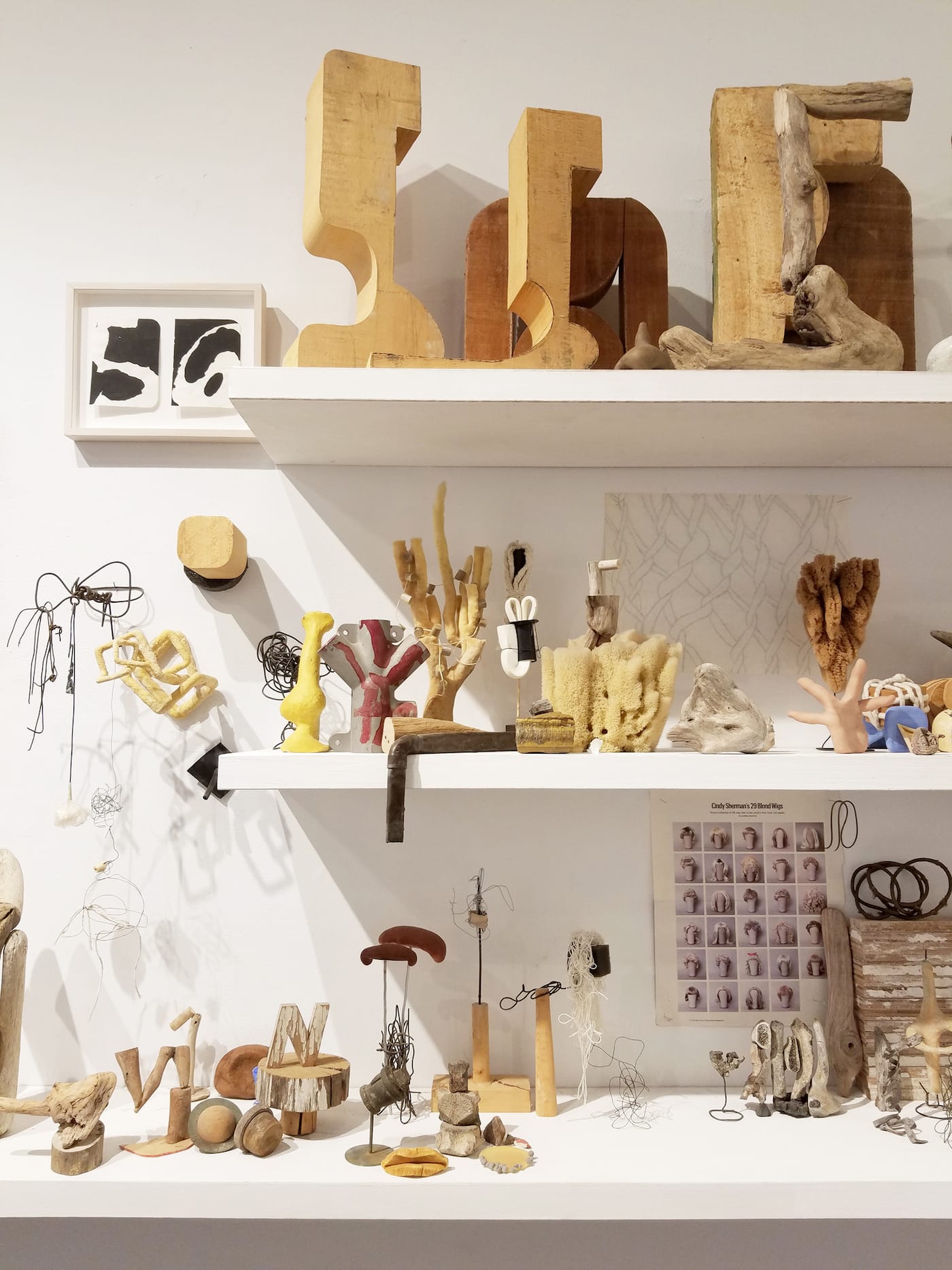 These moderately scaled works are wildly outnumbered by much smaller, ultracasually constructed sculptures that are arranged on three shelves set up on the the longest unbroken wall in the room. Many apparently incorporate found objects. (A few are found objects, unaltered.) There are scores of little jumbles of wire, conjoined bits of wood and cement, urethane foam, stones, plaster, wax, animal bones and the like. Some look a little like amputated digits, or saintly relics, or bizarre fossils, or Neolithic costume jewelry, or petit fours from an alternate patisserie universe.