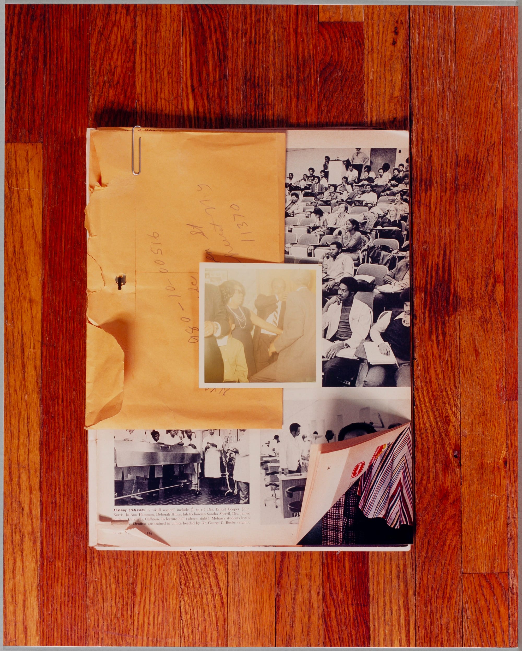 Three collages from Leslie Hewitt’s 10-part series, “Riffs on Real Time” (2006 — 2009) are spread across a free-floating wall at the center of the gallery. Collaging personal documents and photographs with widely circulated images from Ebony and Jet magazines, Hewitt merges the individual with the collective. Meanwhile, the use of domestic flooring as a background underscores the everyday intricacy of record-keeping, reminding us archives can be both institutional and mundane.