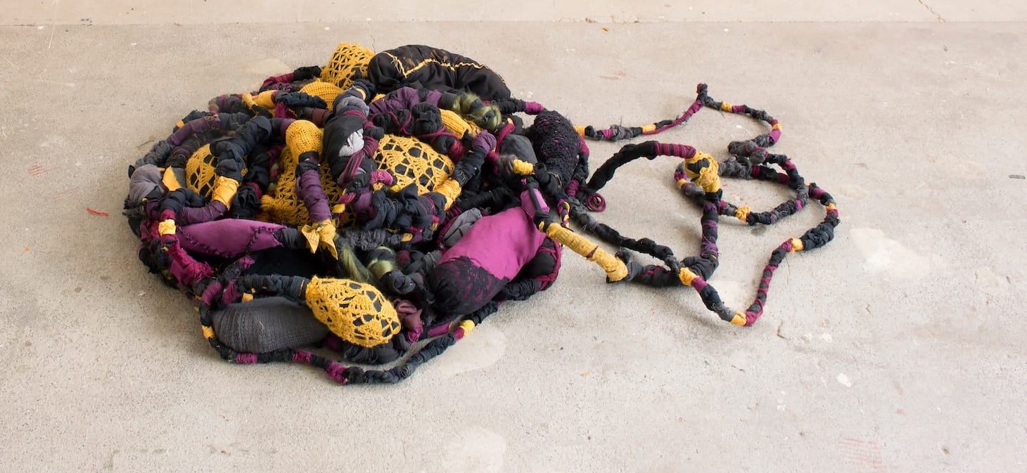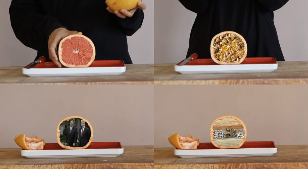 Clearly, for the artists in this show, “offal” connoted a wide variety of guts and entrails, not just the edible, animal kind. Elisa Ortega Montilla used discarded and recycled material to weave the ropes that hang from the ceiling, gathering in a womb-like knot on the floor, while gloria galvez gutted a grapefruit for her film, “i ate the grapefruit’s pulp memory” (2019). We watch her cut the grapefruit down the middle, and slurp the juice from one half while the other half faces us, a sequence of video imagery playing out inside its skin: buzzing bees, a genetic engineering lab, sprouting plants, travel in shipping containers, a glimpse of Mexican federal police and Mexican president Vincente Fox and Bill Clinton strolling. The pulp recalls a stream of global politics and interventions, and we remember that food is complicated by so many factors invisible in market aisles.