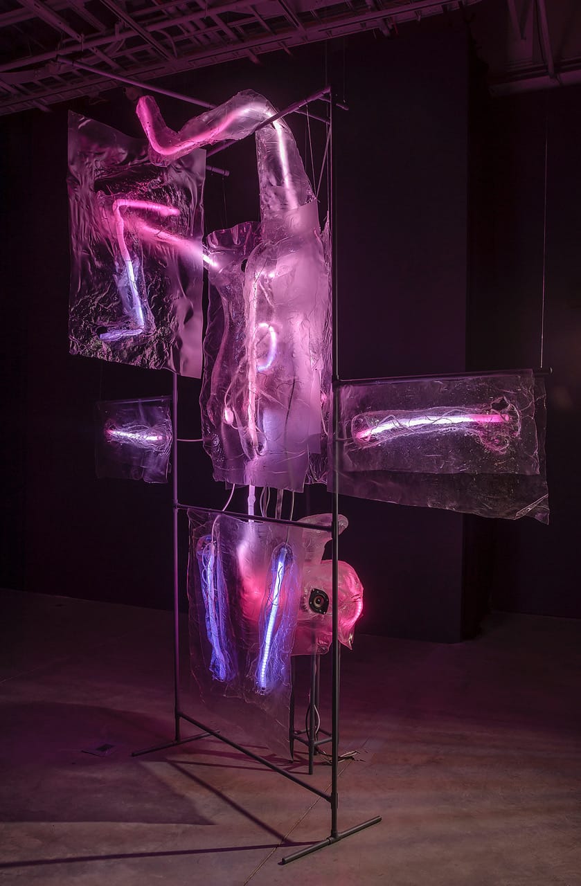 Certain works reference the country’s current political situation, sometimes in crass ways, such as with Jeffery Vallance’s Trump Pareidolia (2019), a two-channel video of slabs of meat and other substances that uncannily resemble Donald Trump — Vallance, an invited artist, sourced his imagery from the archives of a Facebook group established in 2016 to record Trump simulacra. Danial Nord, also invited to contribute to Offal, takes a less overt but more immersive approach to connecting entrails and politics. Installed in a dark room, “Sleeper” (2017) resembles a tall, upside-down figure, with stringy LED limbs encased in plastic — one leg loops over the top of the metal armature helping to hold “Sleeper” up; the LED tubes and cords resemble veins, and a paranoid audio loops: “We don’t know what’s happening, and it’s gotta stop. We will make America safe again, we will make America strong again,” and “They’re bringing in drugs,” “serious drugs.” The rhetoric recalls anti-immigration sentiment, and the uncomfortably wired-up figure begins to seem drugged and disabled by its own misplaced fear.