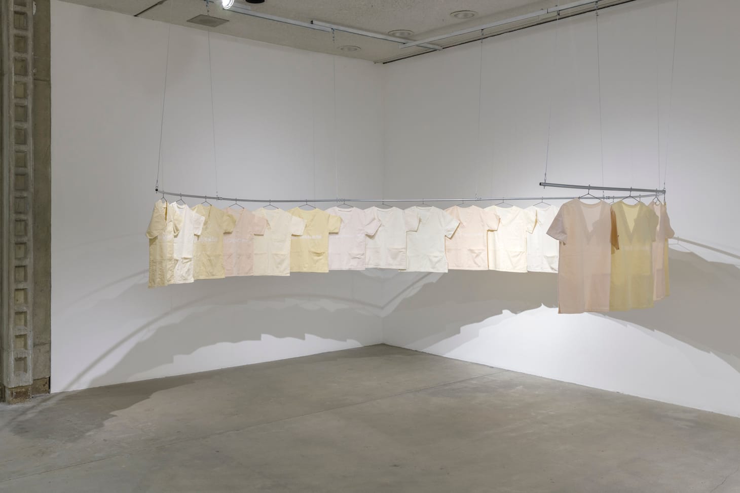But if Offal, like so many such shows, privileges artists with a certain kind of pedigree, it is heterogeneous in other ways. Dakota Noot’s pencil and pen drawing “Learn to Smile” (2017) depicts a torso with pig hooves emerging from the nipples. An intestinal ribbon of pig parts, including a very-much-alive pig’s head with heavily lashed eyes and sharp teeth, arcs across the picture plane, covering the figure’s groin. Sharp and small, the drawing blurs boundaries between man and a potentially edible animal. For her installation “Six Months at Work” (2019), Bonnie Huang recorded a dream about her mother on the backs and fronts of the kind of neutrally colored, familiar shirts that hospice workers often wear. Her mother is ill and dying in the dream, and her work conjures a human body’s inner workings, rather than an animal’s.