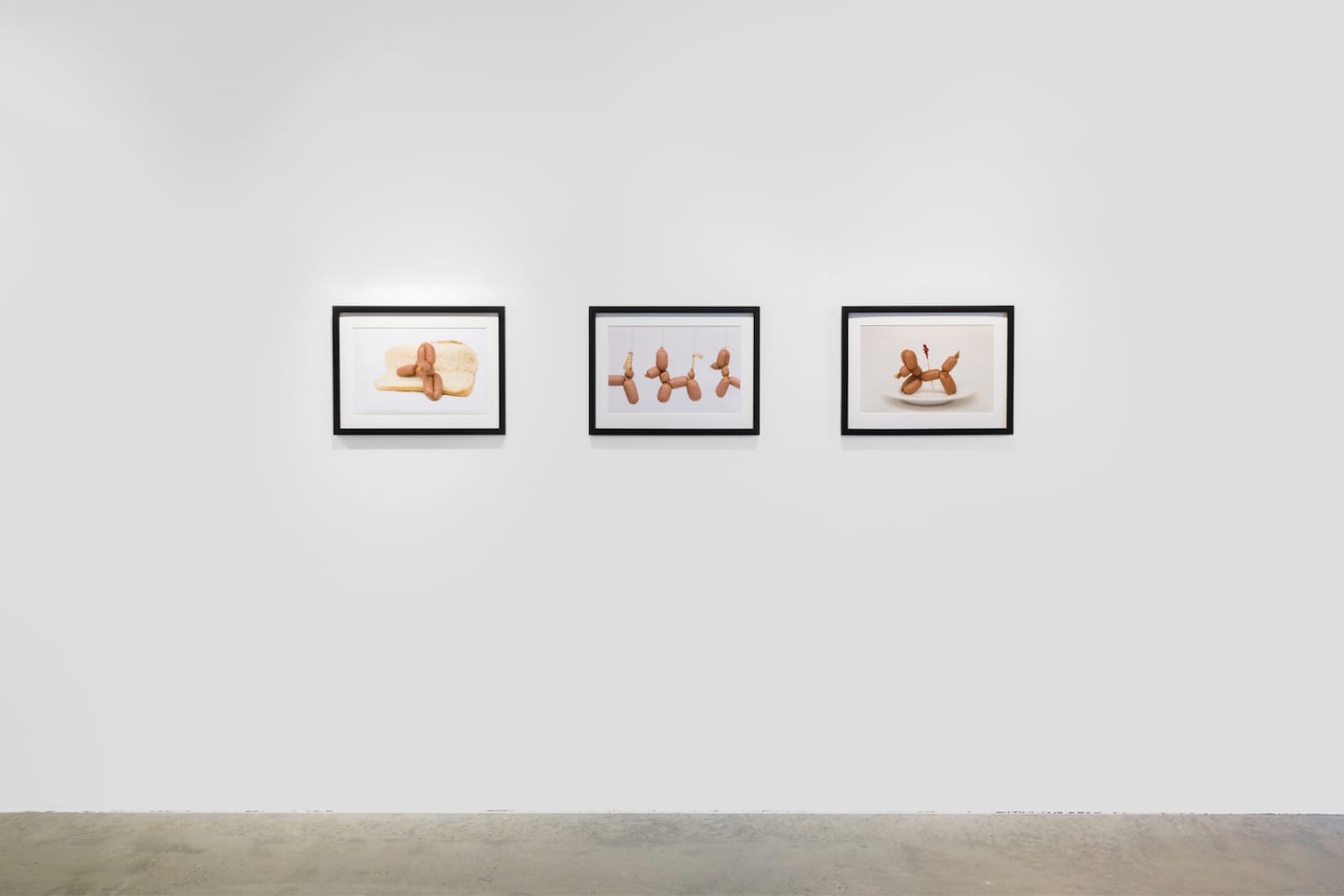 The menus, behind glass in thick, white frames, hang in the group exhibition Offal, up now at Los Angeles Municipal Art Gallery in Barnsdall Park. The word “offal” refers to the viscera, or intestines and internal organs, of animals (Wikipedia illustrates “viscera” with a photo of pâté), and the exhibition’s press release makes a pun of the word, saying that in exploring Los Angeles’s diverse food culture, the exhibition is “ultimately speaking to the offal in all of us.” A show named after innards ought to have some messy moments and blunt edges, and this one luckily does. Hanging nearby Chung-Matheu, Hwang, and Cho’s collaborative menu project are Jeannine Shinoda’s Dog Day’s photographs: bologna sausages, wrapped in clear casings and styled to look like balloon dogs, sit on slices of white bread against a clean white background. The dogs recall Jeff Koons’s much bigger, shinier balloon dogs, if only because Koons’s art world prominence has made balloon animal appropriation seem his territory. But Shinoda’s prints suggest a comically sad school lunch, depicted with the polish and cleanliness of a fashion ad.