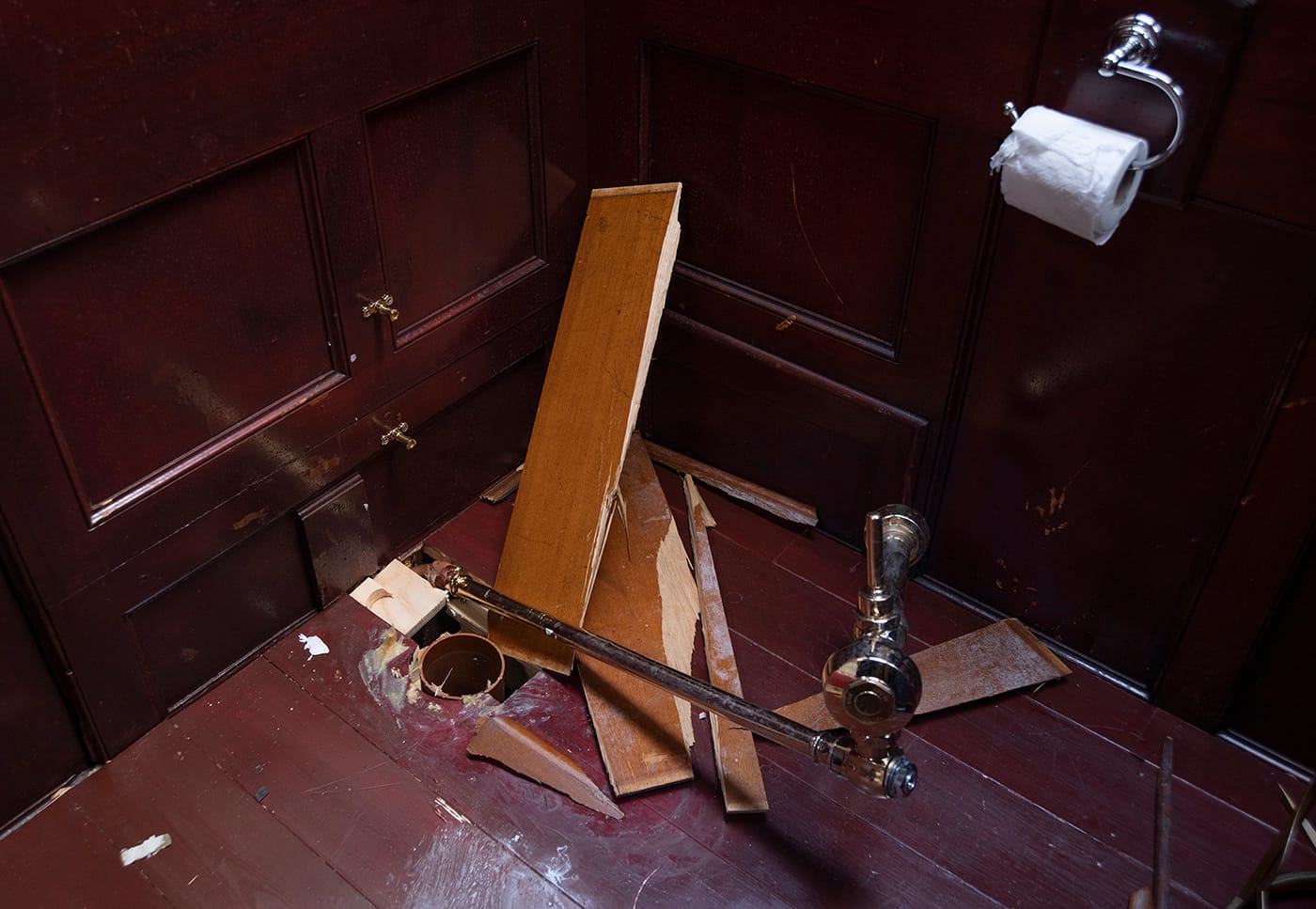 While every bathroom is a crime scene, on occasion, this week the art world sighs and chuckles over the latest audacious act of art theft: the removal of “America” (2016), the solid gold, functioning lavatory by Italian artist Maurizio Cattelan, which until the early morning of Saturday, September 14, was installed in a wood-paneled bathroom at Blenheim Palace — birthplace of Winston Churchill and host to Victory is Not an Option, a massive solo exhibition of Cattelan’s work. The toilet, reportedly worth £4.8 million (~$5.96 million), was torn from the fixtures that enabled visitors to the exhibit to relieve themselves into a work of art. Though I think we can all agree that the only appropriate thing to do with a solid gold art world toilet is rail lines of coke off the tank.