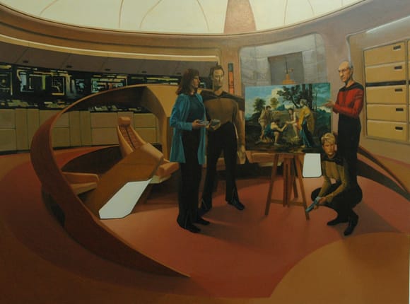This over-the-top campy combination also works because there is something just a little “off” about Gallager’s colors. If he painted straight naturalism, his works would feel as tacky as bad fan art. But there is this subtle brown infused throughout the picture like it had aged through the centuries. At first, I thought something was wrong with my camera when I was trying to capture an image and the image wasn’t coming out right. It’s a testament to his skill that it confused my digital eye. The irony that he is painting what is now vintage science fiction with the reverence of a great historical moment is not lost on the viewer. This stylistic effect gives his painting another dimension beyond its subject matter — so it didn’t just feel like another one-liner.