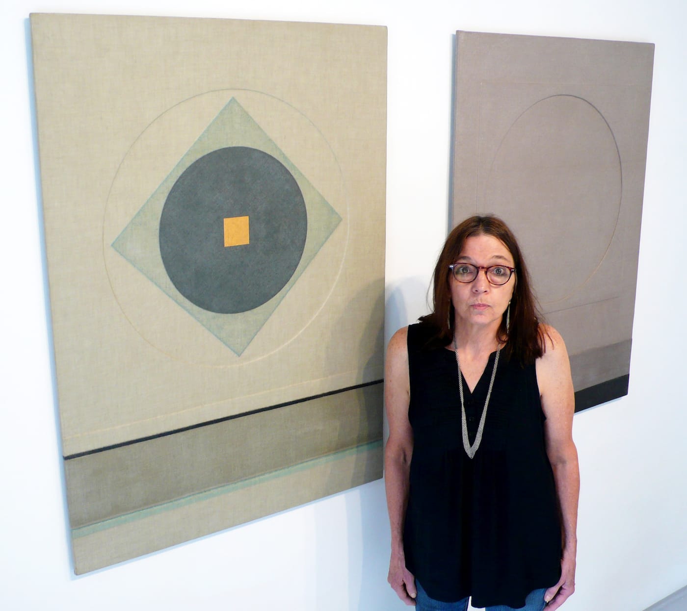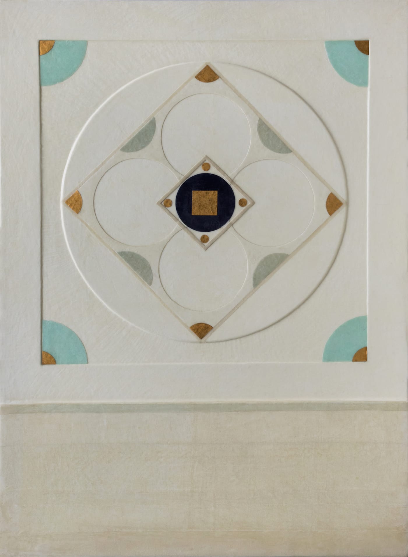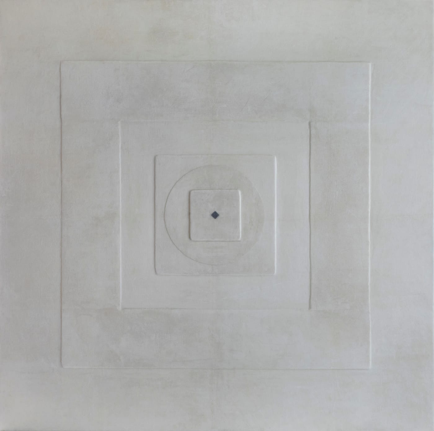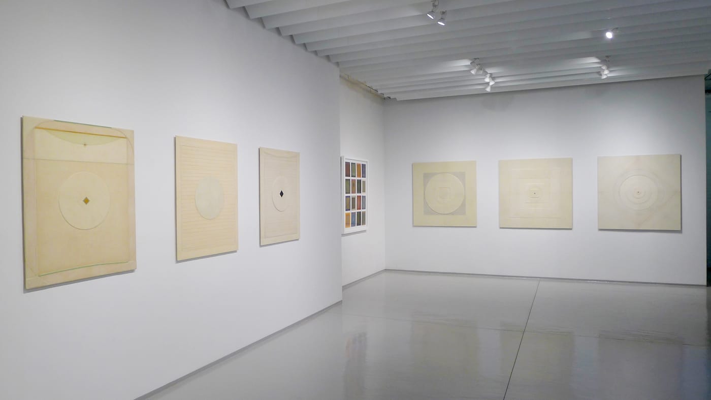 “The new works feature up to ten layers of built-up, ‘drawn’ circles or other shapes,” she pointed out. In addition, Munroe covered these textured-surface “paintings” with a final, thin sheet of wax-dipped cloth, which serves as each piece’s translucent, protective skin. Like all those modernists before her for whom a fundamental visual language of lines, circles, squares, triangles, grids, and other “pure” geometric imagery had provided a launching pad for spiritual lift-off, Munroe felt that she had found a combination of technical methods and material forms that served her communicative purposes.