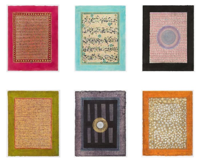 “I made them on some old, French-made paper another artist had given my mother decades ago, and that was later passed on to me,” Munroe said. She explained, “They were big sheets, but since I wanted these drawings to feel more intimate and I wanted to make a lot of them, I cut them down to a smaller size.” Of course, she added, she found a way to apply wax to these smaller sheets of paper, too. Over the years that she has produced these drawings, with their symbol-like marks, dynamic squiggles, and random patterns, she noted, “I’ve used just about every kind of drawing tool or medium you can imagine.” Among them: India ink; markers with brush-shaped tips; vegetable dyes; gold-powder pigment; metallic-ink markers; rubber stamps; and illustrator’s markers.