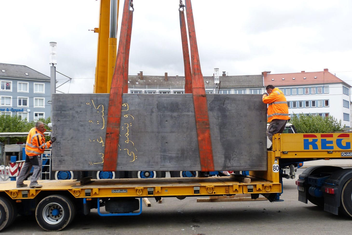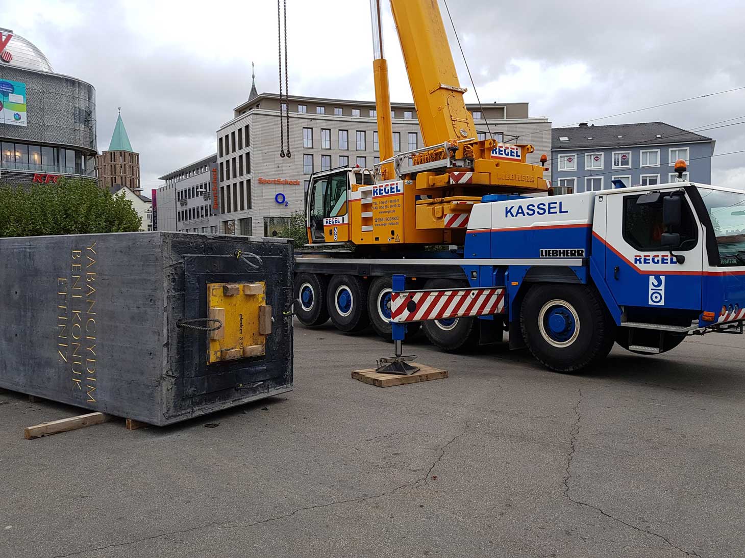 According to reports in a local Kassel newspaper, at about 4:30 am CET, workers from a local construction company began dismantling the obelisk, titled “Monument to Strangers and Refugees,” with two heavy cranes. By 9:30 am, the report states, the obelisk was entirely gone, strapped to a flatbed truck and sent to a construction site on the outskirts of the city (where it now remains).