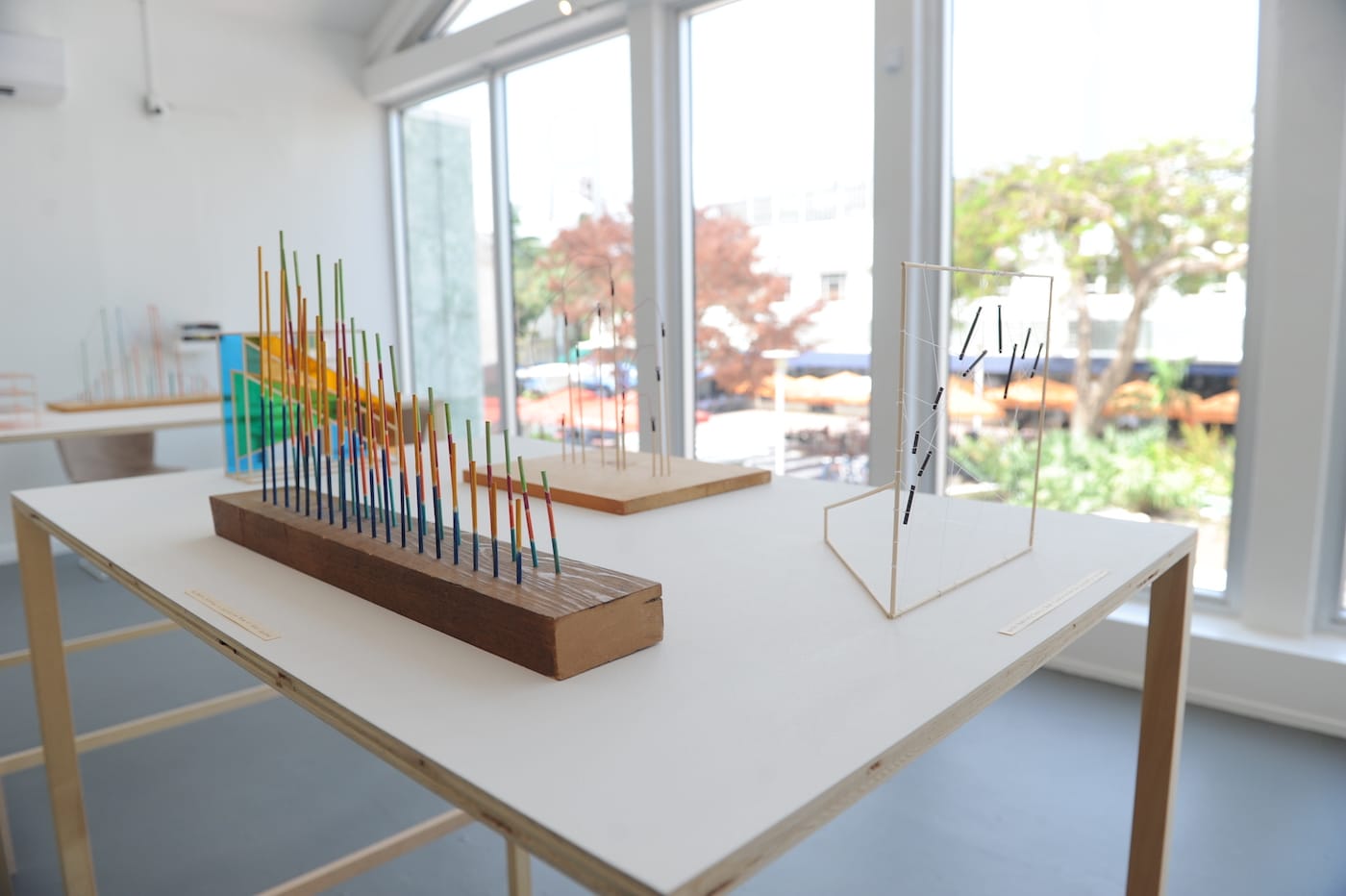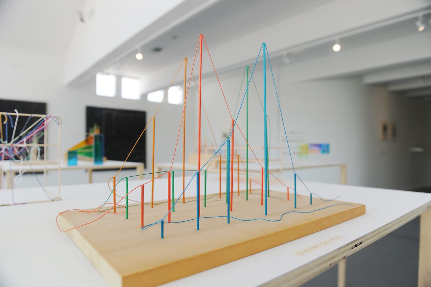 For “13 scuptures from Each Number Equals One Inahaltion and One Exhalation,” Richard Ibghy and Marilou Lemmens mined data that examined human productivity over the past three centuries in various fields. The results are manifested into small playful sculptures, not unlike toys or abacuses; the amount of productivity correlates to the height of tiny sticks, the bright colors of gel panels, and the length of strings. Authoritarianism and imposed work ethics are vitiated in favor of color and play.