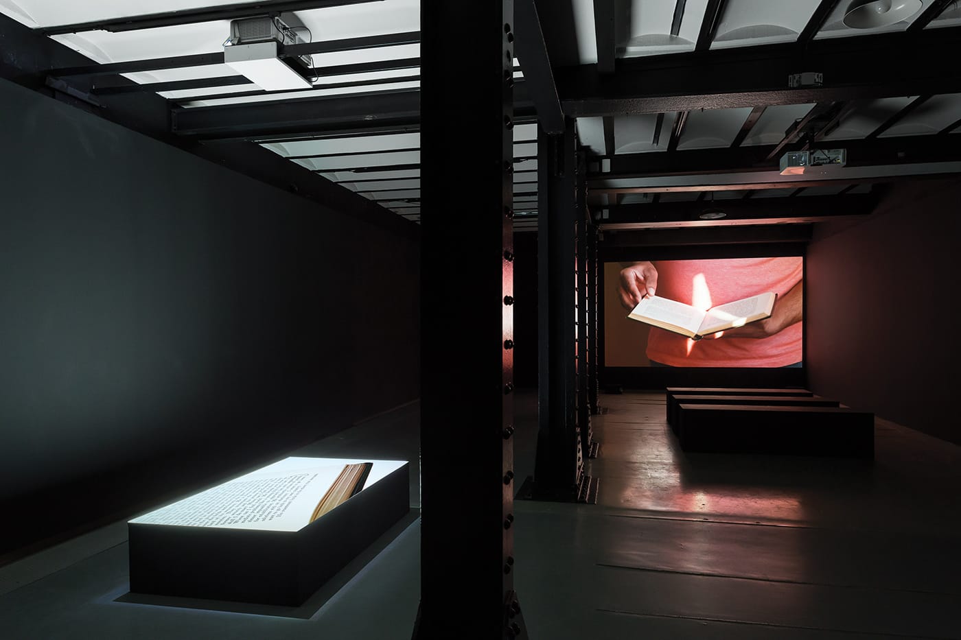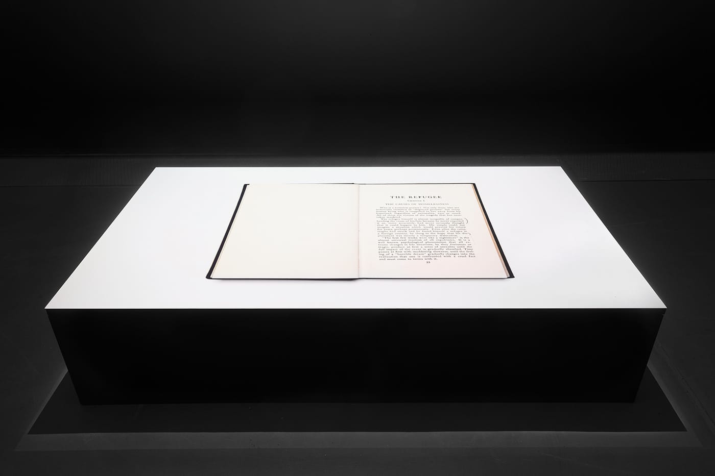 LISBON — A dark, solemn space is illuminated by two glowing projections in On Exile, a documentary project by Portuguese intermedia artist José Carlos Teixeira, on display at the Museu de Arte, Arquitetura e Tecnologia (MAAT). The first throws light down from above onto a plinth, presenting pages from a book titled The Refugee, written in 1957 by a German-Lithuanian philosopher named K.C. Cirtautas.