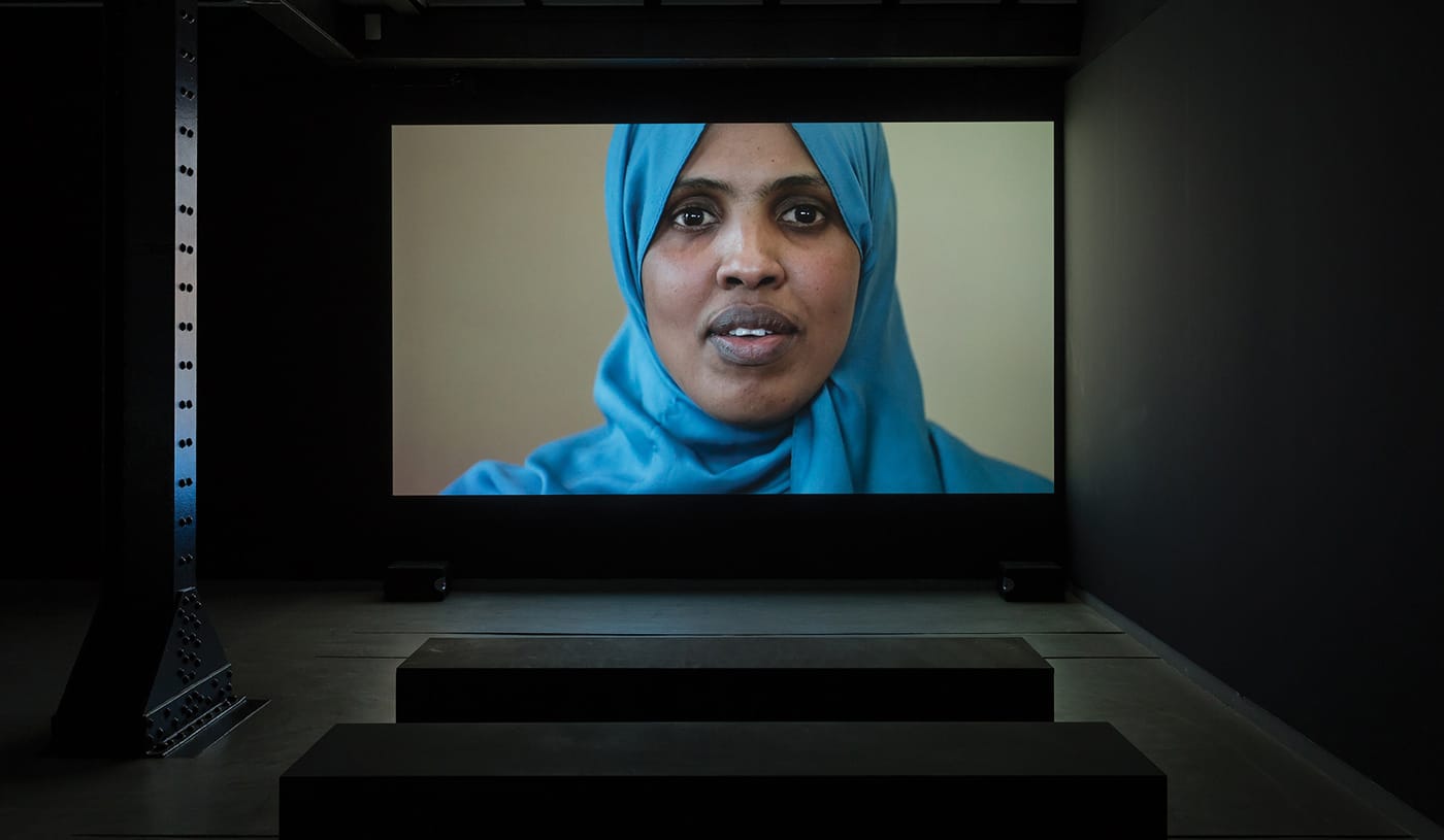 This work comprises the second aspect of the installation, and is the main focal point of the exhibition: a 70-minute documentary that cobbling together Teixeira’s interviews with the refugees. People speak of their homeland, as the film presents close, unwavering shots of their faces. A woman in a bright blue hijab sings a song from Somalia. A girl and her mother discuss the conditions that caused their family to flee Iraq. Subjects touch on topics that are, perhaps, to be expected in the context of a refugee story: persecution, fear, danger, lost family members, uncertainty, homesickness, longing, and disorientation. But just as often, there is hope, gratitude, and positivity about the new life they’ve found in the United States.