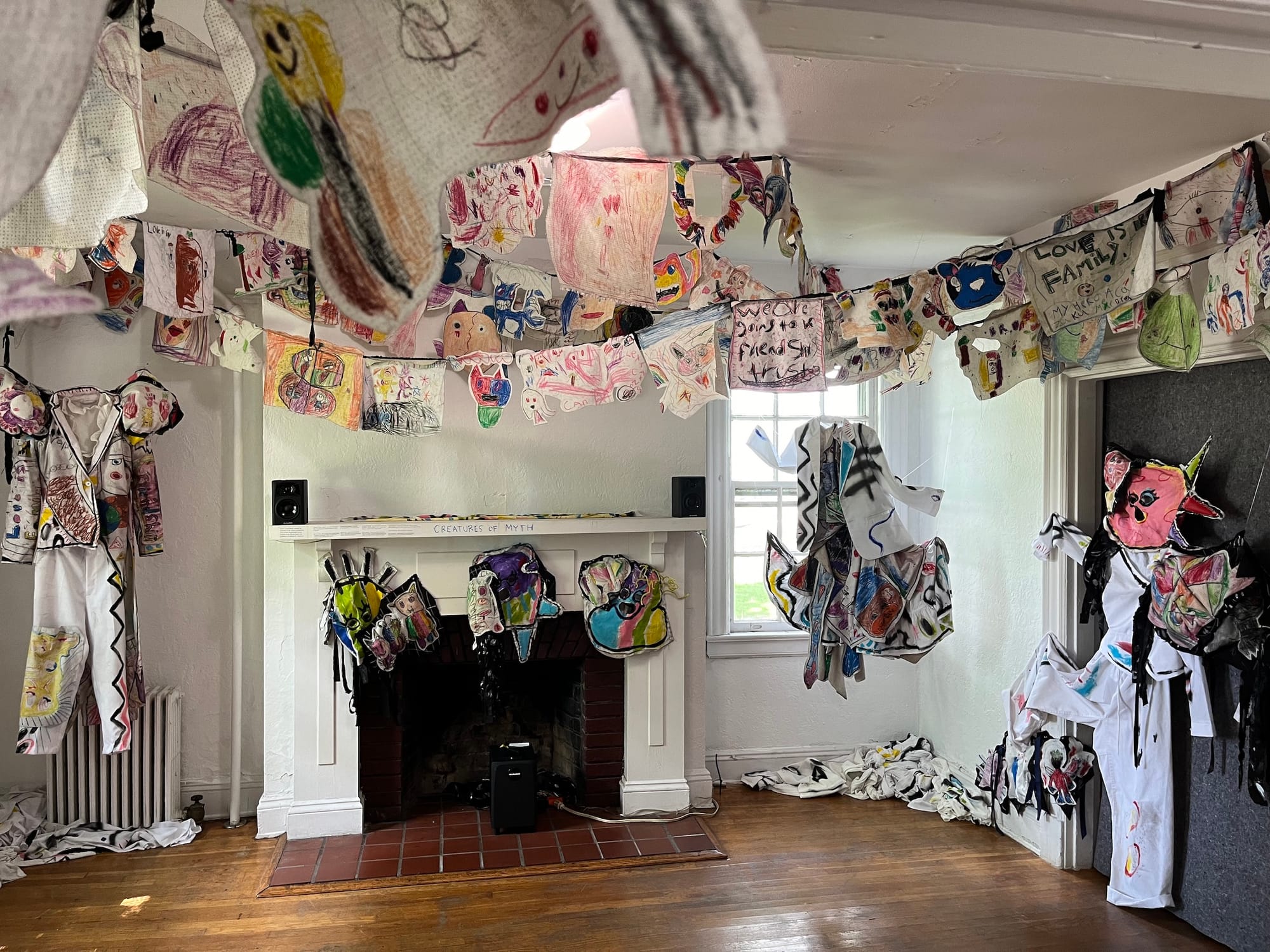 Schumacher is used to odd scenes on the island, especially in its historic Colonels’ Row district. The BronxArtSpace director recently finished unloading a U-Haul filled with art materials that she drove from the gallery in Hunts Point to the ferry at the tip of Manhattan for her fourth summer as a participant in Organizations in Residence, a seasonal artists residency run by Governors Island Arts since 2010. Among them was a swath of colorful fabric figures created by Bronx middle school students with artist Lexy Ho-Tai and Metropolitan Opera singer Anthony Roth Costanzo, which she installed in the living room of Colonels’ Row Building 410A, one of several three-story brick structures that once housed military officers and their families when the island served as the United States Army headquarters after the Civil War.