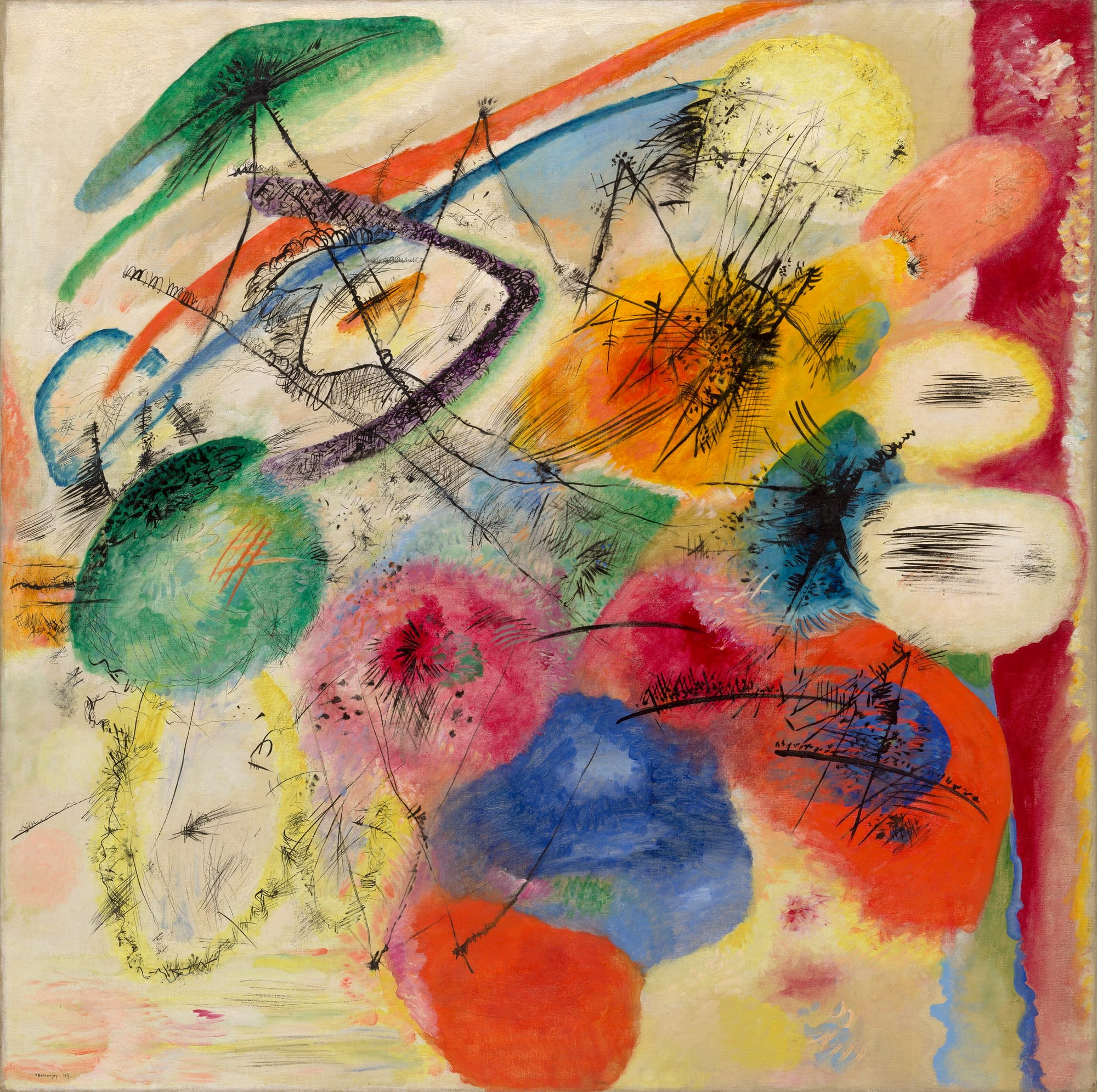 A few weeks after the concert, Marc wrote to a friend: “Can you imagine a music in which tonality (that is, the adherence to any key) is completely suspended? I was constantly reminded of Kandinsky’s large Composition, which also permits no trace of tonality and also of Kandinsky’s ‘jumping spots’ in hearing this music….”