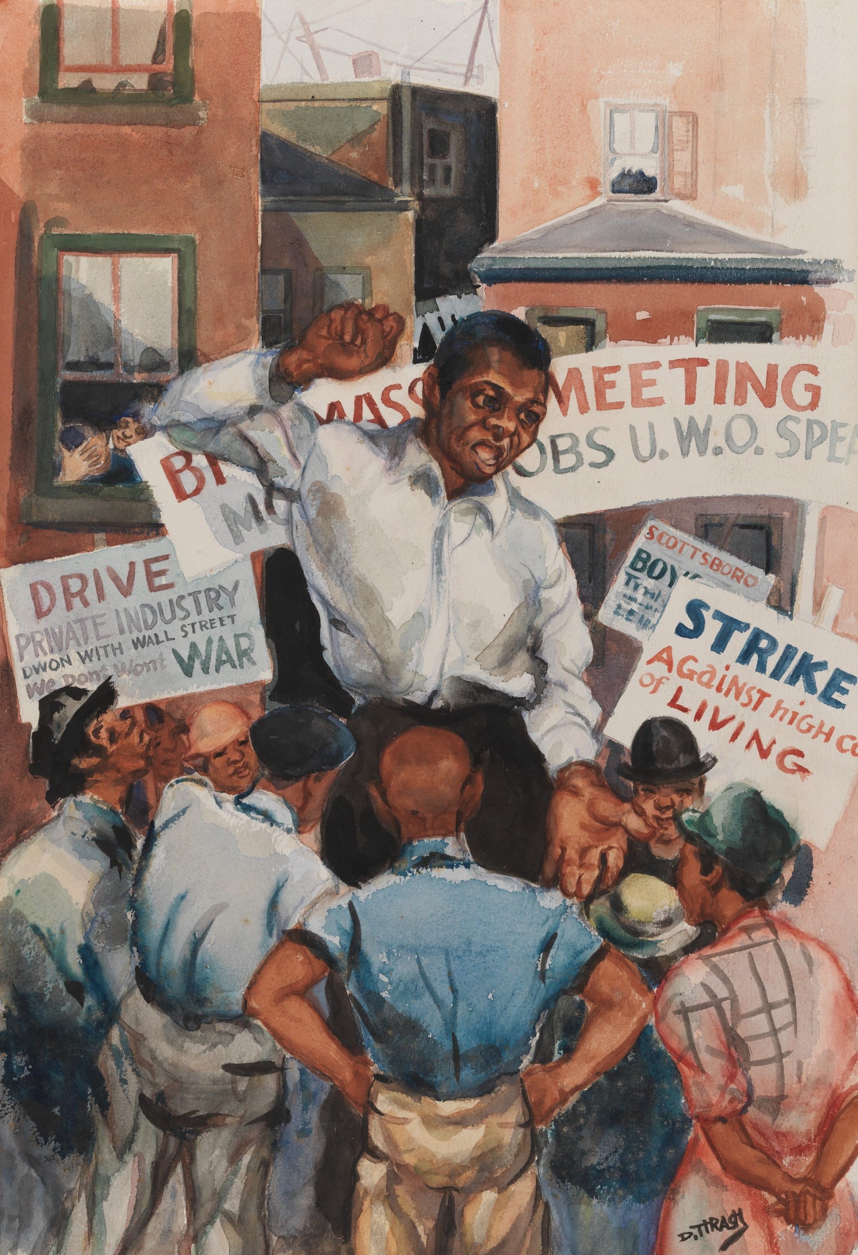 Dox Thrash, "Untitled (Strike)" (c. 1940), watercolor, 17 1/8 x 12 inches; Pennsylvania Academy of the Fine Arts, Philadelphia, Museum Purchase (image courtesy the Metropolitan Museum of Art, New York)