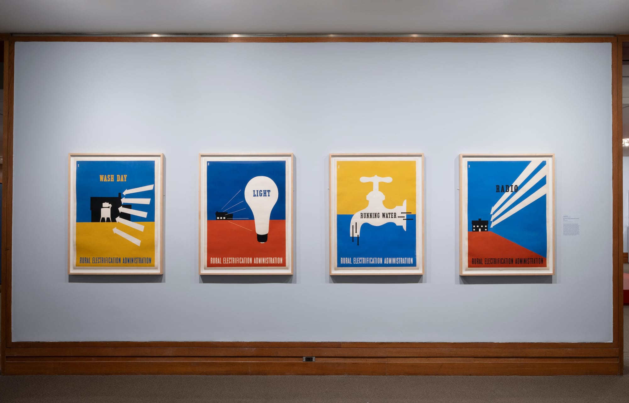 Installation view of Art for the Millions: American Culture and Politics in the 1930s at the Metropolitan Museum of Art. Pictured: works by Lester Beall (photo Richard Lee, courtesy the Metropolitan Museum of Art)