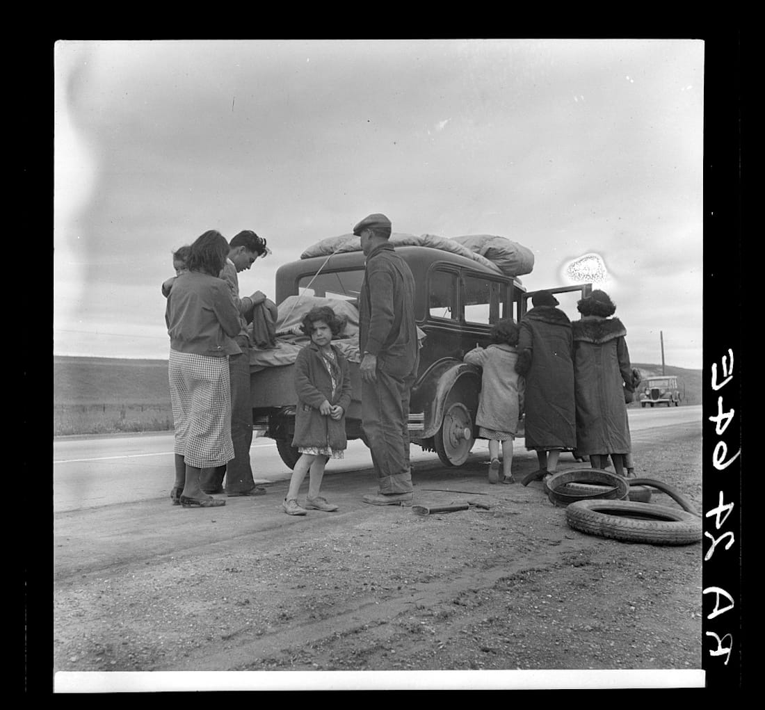 Dorothea Lange, "Migrants, family of Mexicans, on road with tire trouble. Looking for work in the peas. California" (February 1936), gelatin silver print (image via Library of Congress, Prints & Photographs Division, FSA/OWI Collection, LC-USF347-002464)