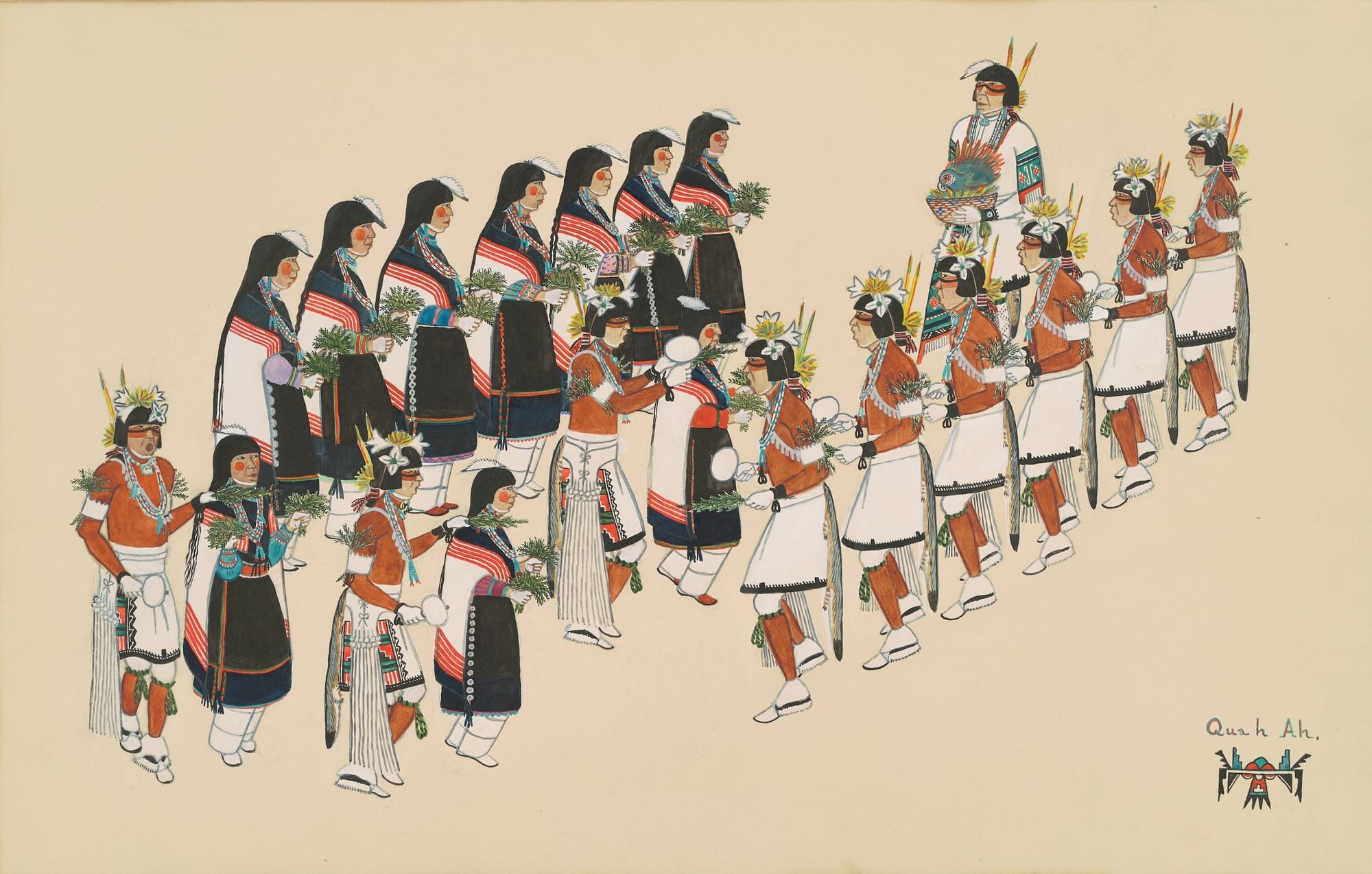 Tonita Peña (Quah Ah; Cochiti Pueblo, born San Ildefonso Pueblo), "Pueblo Parrot Dance" (c. 1935), gouache over graphite on wove paper, 14 x 22 inches; National Gallery of Art, Washington D.C., Corcoran Collection (image courtesy the Metropolitan Museum of Art, New York)