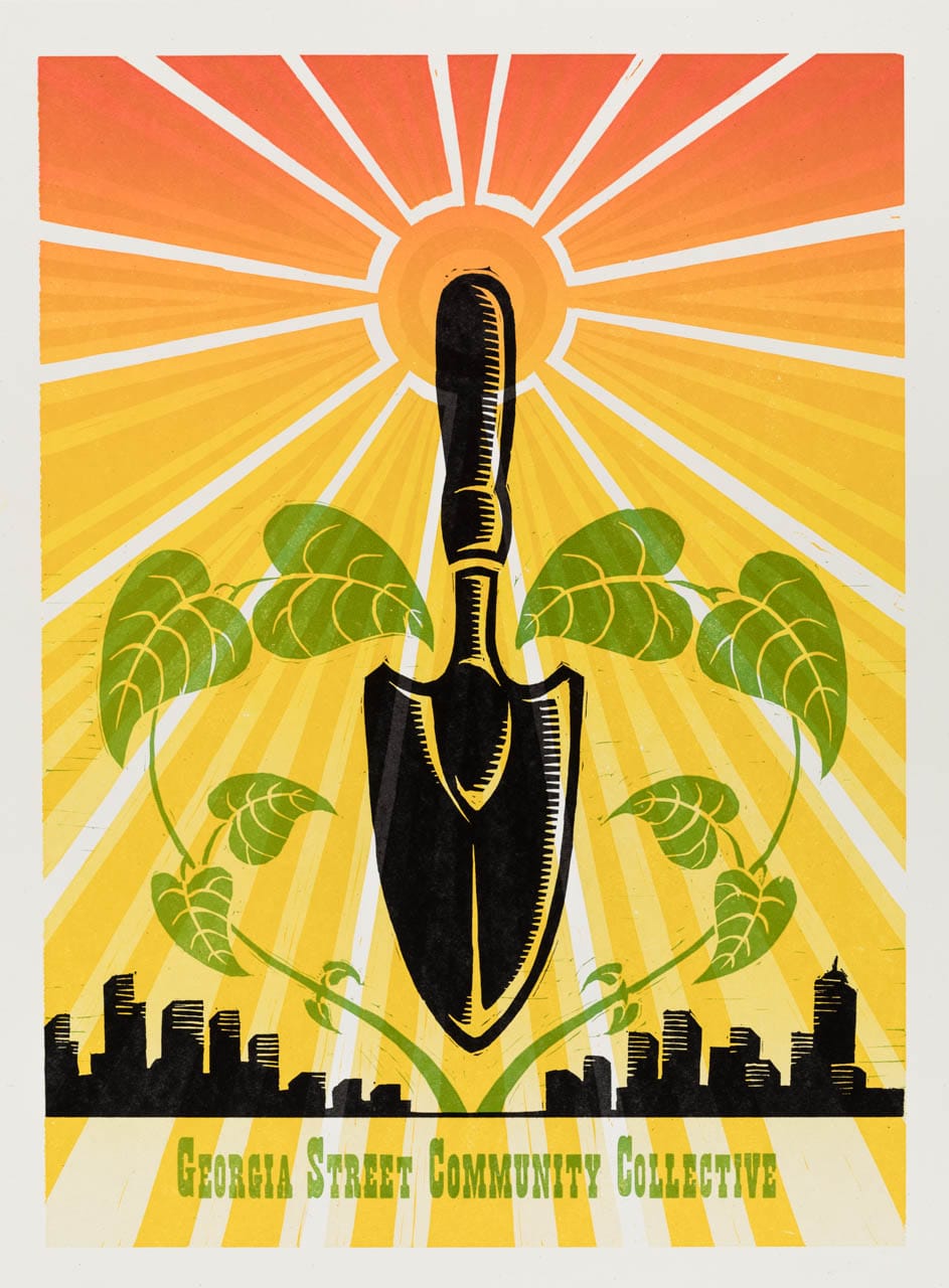 Mark Arminski is a Detroit native whose love of art was fostered early on through Saturday afternoon trips with his mother to the Detroit Institute of Arts. He attended the College for Creative Studies, and found his artistic voice in the 1980s, when he began working with various printmaking and photo techniques and incorporating those in his work with the human form. By the 1990s he was designing and printing posters for emerging national and local bands. Arminski selected Georgia Street Community Collective, an agricultural complex founded by Mark Covington, who is a resident of the neighborhood near Harper and Gratiot where GSCC is located.