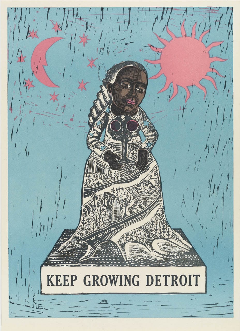On Press evolved to include 12 Detroit artists and pair them with Detroit nonprofit service organization of their choosing — each artist would then create an original print work celebrating the work of the organization. Each invited artist received an honorarium, and the selected nonprofits receives 50% of the profit from the sales of the limited edition prints. On July 12, the results of the first cohort of six artists made their debut at Signal Return, and the results are a celebration of some of Detroit’s best qualities: artists involved in social practice, organizations oriented toward shaping an equitable and inclusive city through food sovereignty, and environmental justice, and opportunities to leverage the overlap between the two.