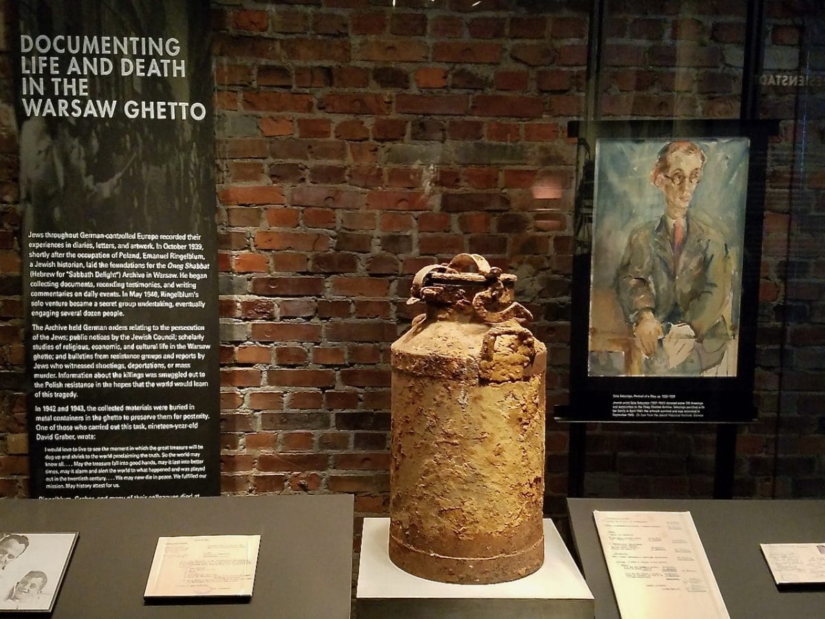 An eight-foot-tall, 35-foot-long cast of the Warsaw Ghetto’s largest remaining wall stretches down a long hallway. A milk can that once housed part of the Oneg Shabbat Archive, excavated from its grave in 1950, appears within an enclosure before the wall. Hidden as future testimony at great risk, these precious documents supply authoritative information about the ghetto, providing one of its most lasting legacies.