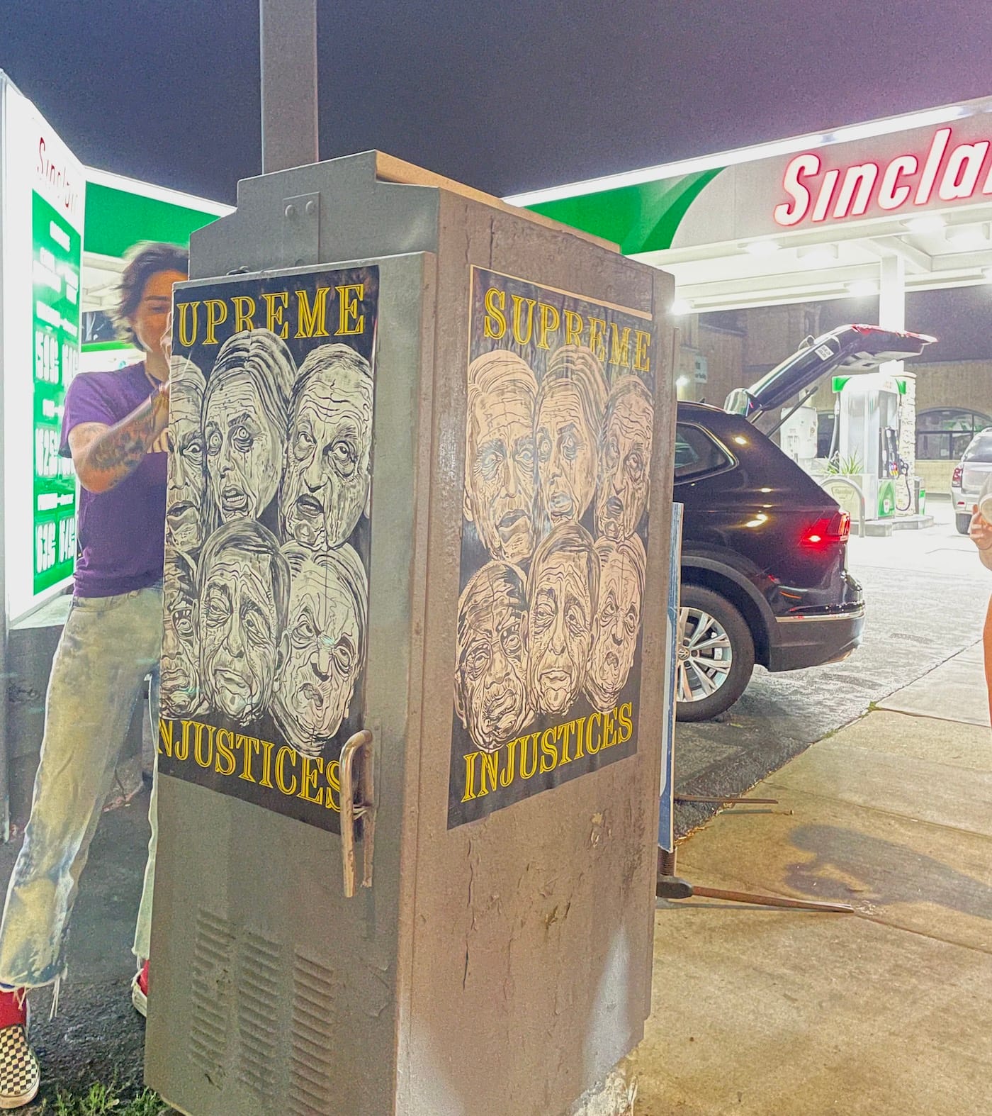 Last Friday night, a group of about 100 people crowded into the back room at Canter’s, the iconic 24-hour Jewish Deli in Los Angeles's Fairfax District. Some nursed cups of coffee or devoured pastrami sandwiches — but they hadn’t come to eat, they had come to protest. Earlier that day, the United States Supreme Court had overturned Roe v. Wade, the 1973 decision that guaranteed the constitutional right to abortion. The multi-generational group had gathered at the behest of artist Robbie Conal, who needed an army of volunteers to put up his latest poster bearing the ghoulish countenances of the five justices who voted to strike down Roe (as well as Justice Roberts, whose opinion concurred with their judgment). In case Conal’s message wasn’t clear from the grotesque depictions, a bold, yellow text reading “SUPREME INJUSTICES” left no doubt.