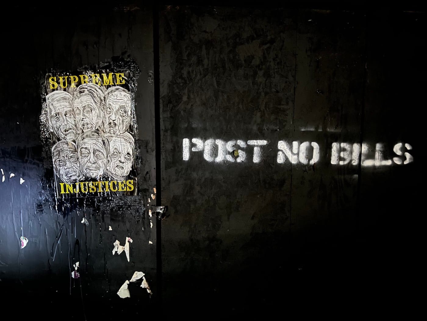 Hundreds of copies of the LA-based guerrilla poster artist Robbie Conal’s latest work, “Supreme Injustices,” were pasted up from Venice to Los Feliz.