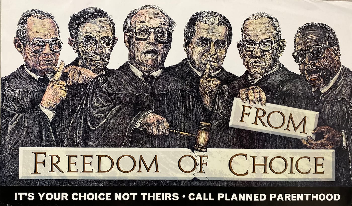 The pair designed a poster featuring Clarence Thomas and five justices who had recently upheld the “gag rule.” The illustration shows the justices replacing the phrase "Freedom of Choice" with "Freedom from Choice." Wagle and her friends, a group of women whom Conal dubbed the “Guerrilla Matrons” after the Guerrilla Girls, met at Canter’s with the artist to plot their poster campaign. Eventually, 25,000 posters were printed and sent to Planned Parenthood chapters across the country, bringing the message to 73 cities, according to Conal.