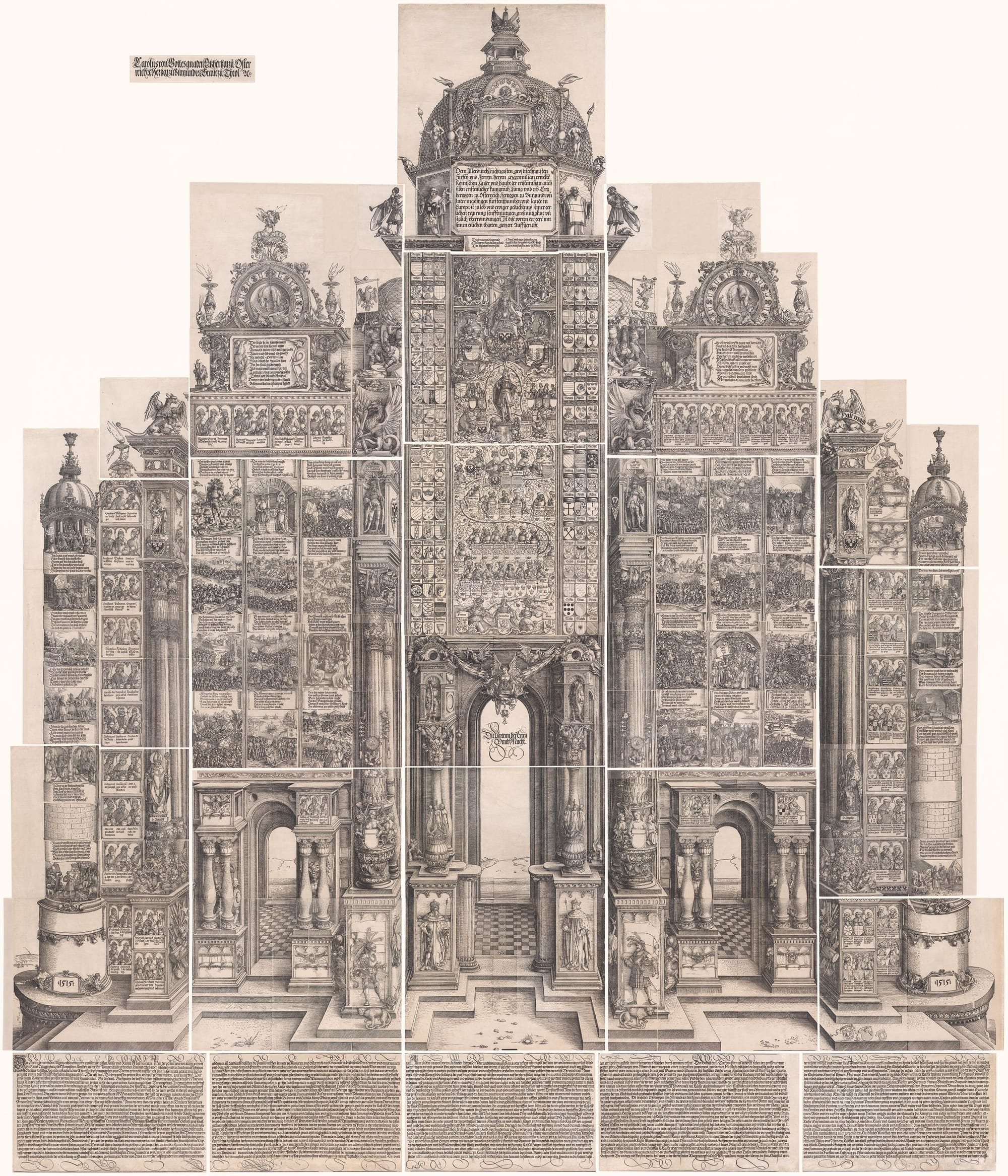 In 1512, Holy Roman Emperor Maximilian I commissioned German printmaker Albrecht Dürer to create a work of imperial propaganda for display on palace walls and city halls. Known in its time as Maximilian’s “Arch of Honor” and referred to now as the “Triumphal Arch,” the multi-paneled woodcut print, measuring approximately 13 feet (four meters) high, is one of the largest such works ever made. Dürer relied on an entire studio of assistants, students, carvers, and advisors to help him craft the work over a period of more than two years.