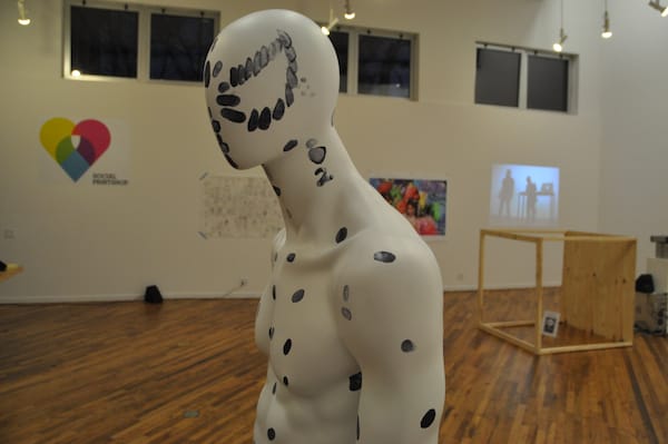 Man Bartlett’s “Kin” during the last day of #TheSocialGraph exhibition. We will have a photo essay tomorrow and there are a few more podcasts on the way, but last Saturday we threw a closing party for the show, which featured livestreaming of Man Bartlett’s “#24hKith” performance for the first hour of the event (the final hour of his performance) and a listening party for the Sound of Art album. Also, in a few weeks we will be announcing the publication of the #TheSocialGraph catalogue, which will include essays, photos, explanations and other texts to reveal a few more facets of the world of social media art.