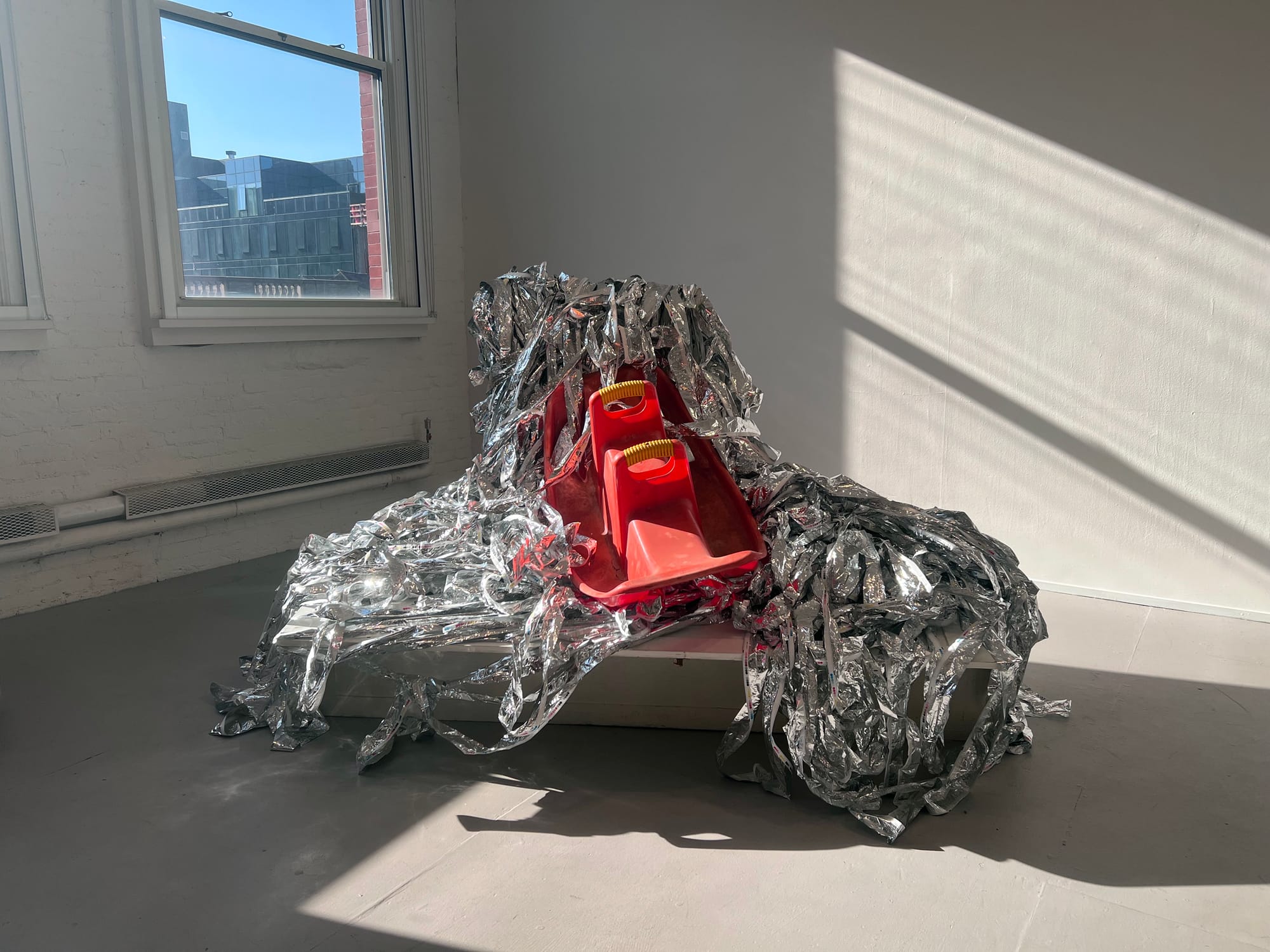 In a room thick with memory, there is a thing — that’s the closest word I have for it — irradiated by late afternoon light. Before your eyes, it toggles between meaning and pointlessness, resembling, by turns, a rocking horse-like toy set atop a glimmering metallic ocean of plastic wrappers, like a chariot riding toward salvation, and a municipal-orange tossaway randomly placed on a heap of other nothings. Not a symbol, simply evidence that something destructive occurred.