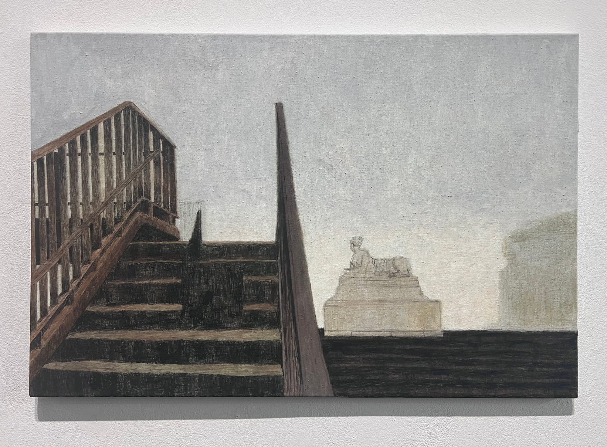 These strategies — drawing attention to the formal qualities of that which we’ve collectively authored in the form of overproduction, and to the impossibility of really grasping the vastness of overproduction as individuals — make for an interesting exhibition, but I’m not convinced that it’s enough to actually sustain an artistic movement. Even in this context, certain strategies, effective at first, began to feel either repetitive or thin, such as video art as a tool to express deep time. Somewhat counterintuitively, it’s a work in possibly the most primitive media here — painting — that felt among the most effective. Samuel Hindolo’s “Gare de Bruxelles-Nord” (2024) is de Chirico-like in its almost hieroglyphic compositional clarity. In its delirious juxtaposition of familiar elements — sphinx, staircase, sky — it destabilizes in ways impossible and familiar.