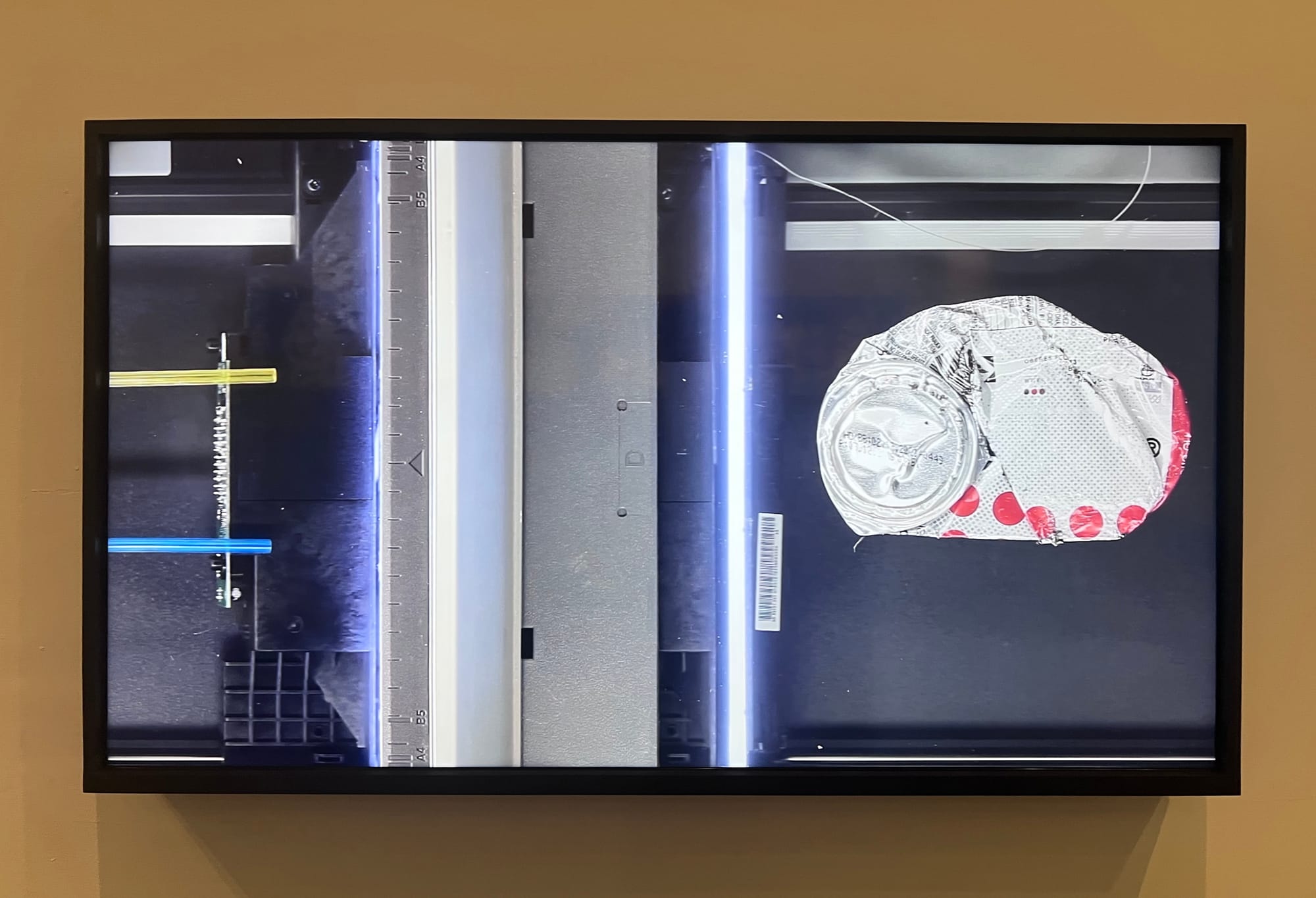 It’s Georgian artist Tolia Astakhishvili who most successfully gestures to the sublimity of human overproduction, doing so via a mechanics of exhaustion. In Astakhishvili and David Perice’s two-channel video “so many things I'd like to tell you” (2025), objects like a crushed coke can, a spoon, and a packet of pills pass through a scanner. These familiar objects, made uncanny in this clinical context, as if sourced from an archaeological dig in the future, are interesting at first; then the attention flags. It’s the difference between being directed toward a particularly witty piece of subway graffiti and being asked to examine every tile in a station.