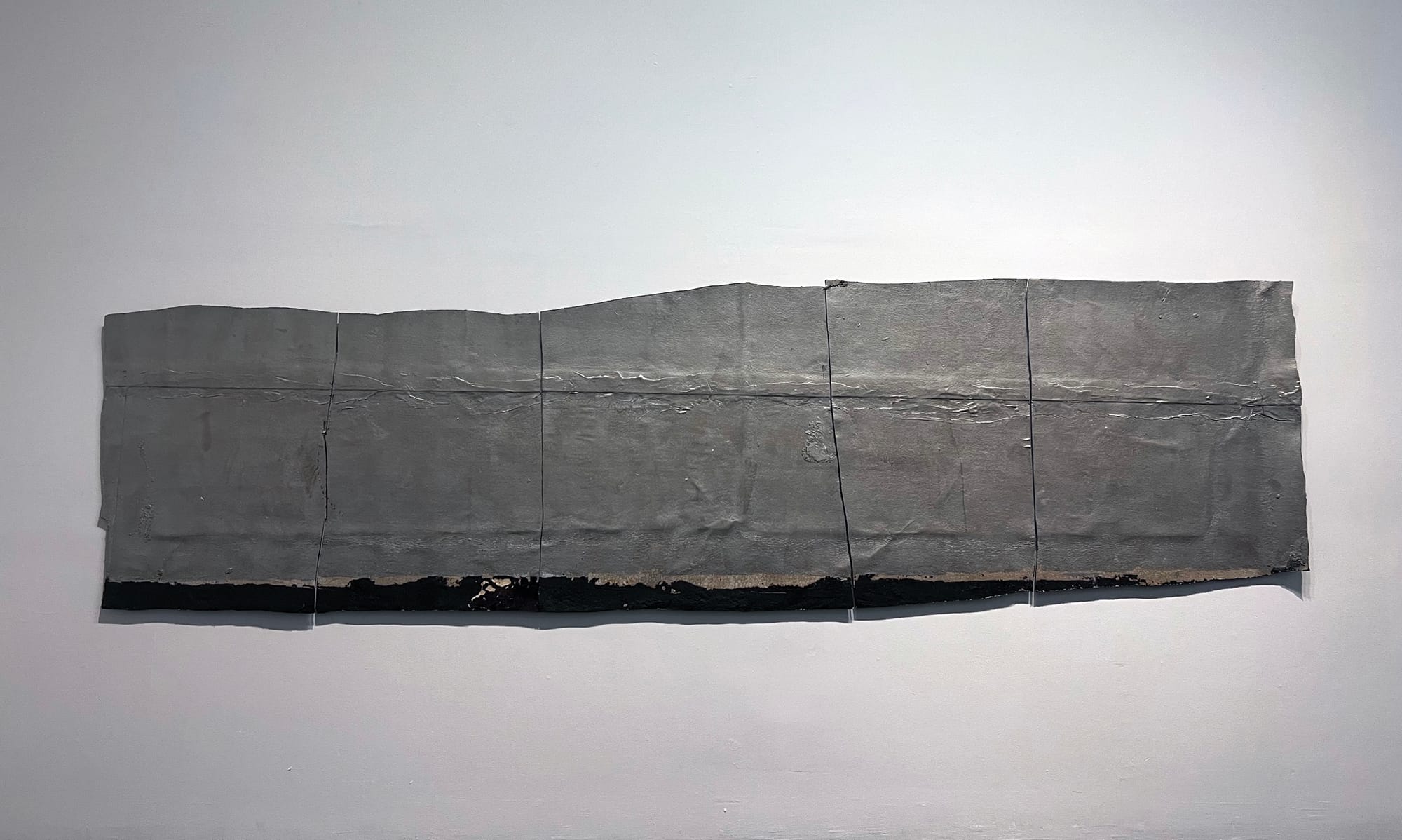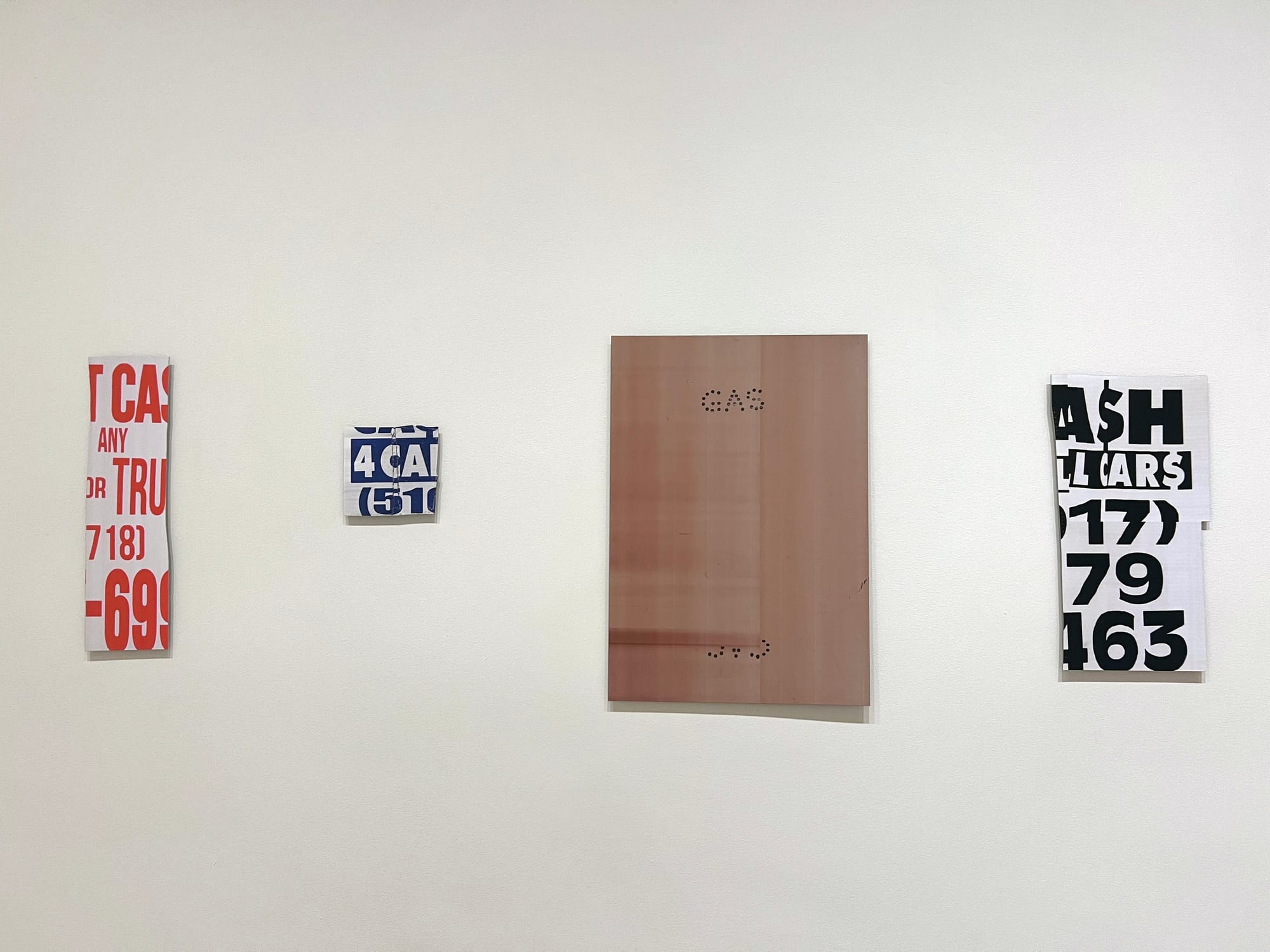 The most common strategy in this exhibition is to reframe the detritus of capitalism as formally interesting. Bosnian artist Selma Selman, for instance, presents an industrial nail gilded with gold extracted from motherboards scrapped by her family’s metal recycling business (“Nail,” 2025) and a construction claw repurposed as a blossom that opens and closes with a loud, grinding noise (“Flowers of Life,” 2025). Klara Liden’s “Untitled (Membrane 5)” (2025) is a slab of roofing material that looks every bit like an intentional work of abstraction. British artist’s Nick Relph’s dye sublimation aluminum prints consist of 1:1 reproductions of city surfaces and signages, locating art in overlooked niches of the city.