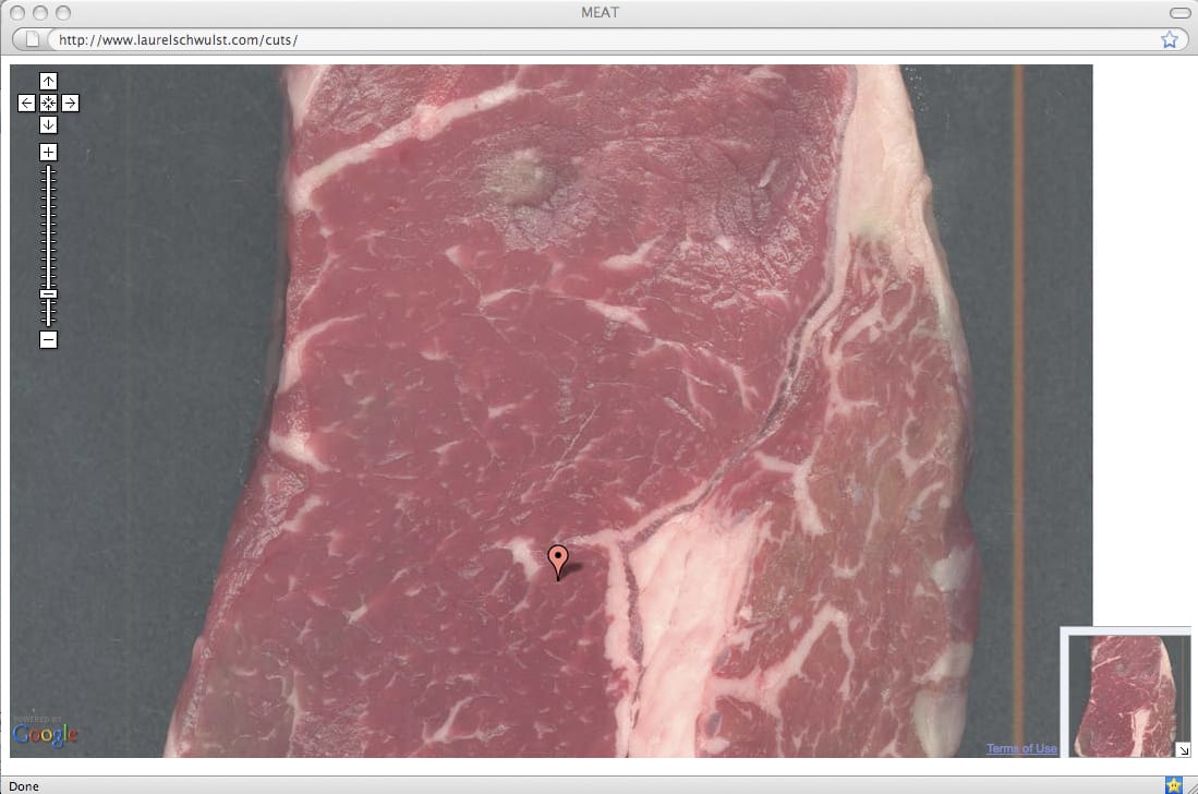 “Screens” is fun, but it doesn’t go as far as other works in investigating the porous border between the natural and the digital. “States,” a Flash-based animation in which the black silhouettes of US states morph into one another, and “Meat,” a scanned steak meant to represent the landscape of an enormous park explorable virtually with the Google Maps API, are both more evocative. The visual vocabulary of “States” brings to mind state parks, abstract emblems of iconic geography, while the mapped meat becomes a fleshy micro- and macrocosm of the human body’s relationship to nature.