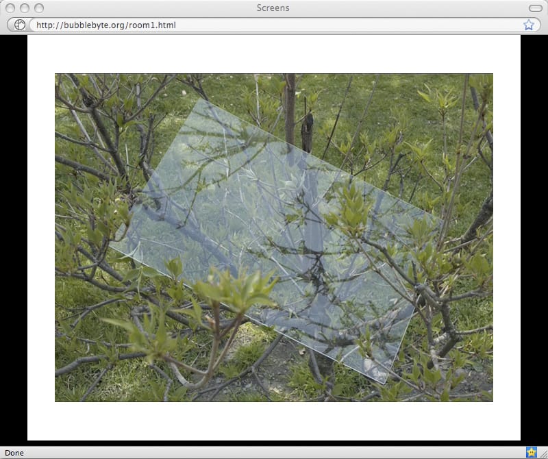 At once architectural propositions, thought exercises and internet works in themselves, Schwulst’s “Screens,” “Selected Sunsets,” “States” and “Meat” (all 2010) are arranged in a square grid frame on the exhibition landing page of bubblebyte.org. There’s no strict order to the works; visitors simply click a work’s title to open it in a pop-up window or click on a three word description below the titles to open a pop-up artist statement. At right is the exhibition’s description and schedule. Schwurst’s work will be online through April 28, at which point it will join the archive as a listing, not a live site.
