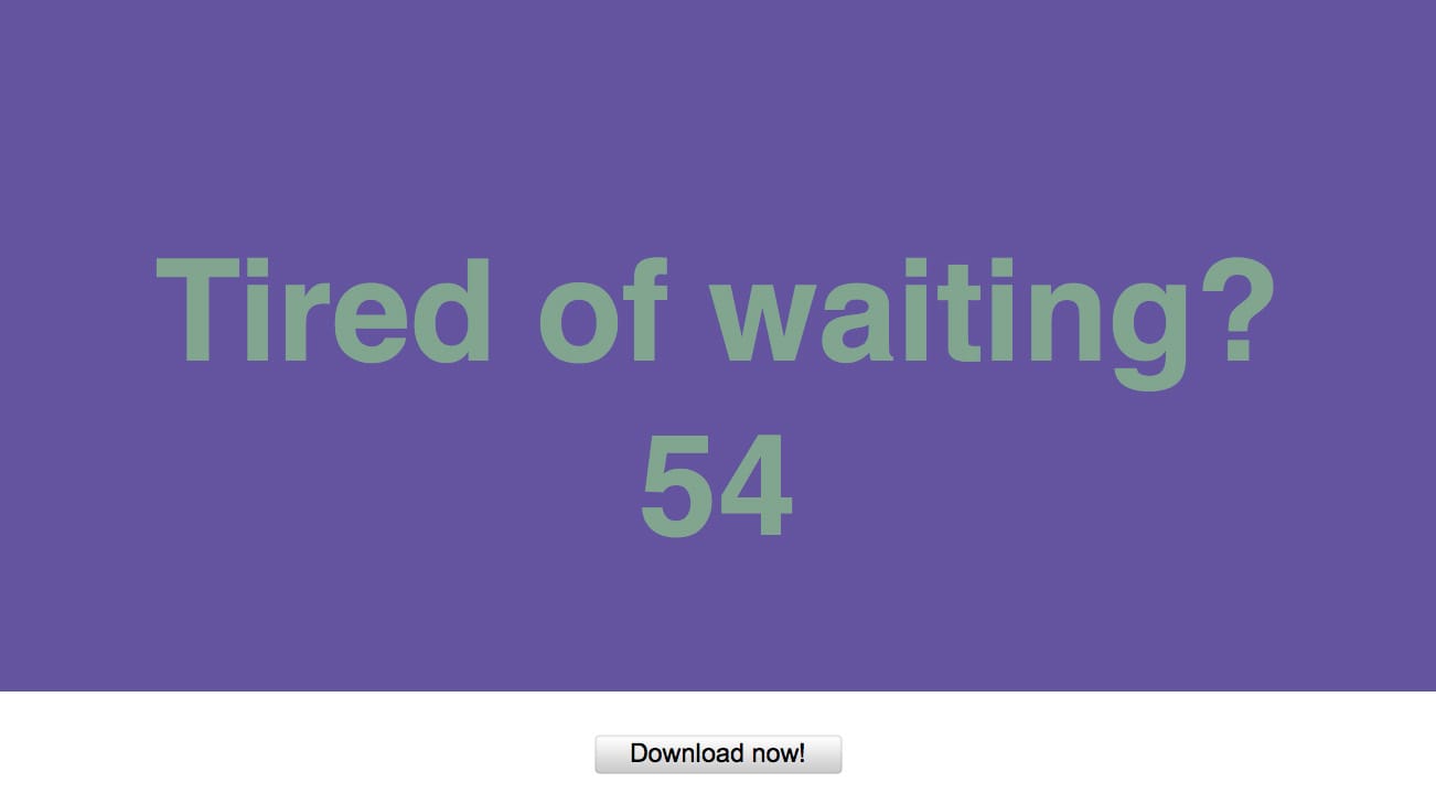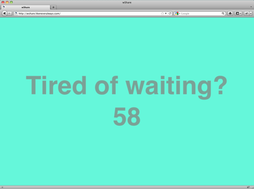 A simple splash screen with the sans-serif words “Tired of Waiting?” splayed across the center and a countdown clock below, “wShare” is classic internet art — an economy of means produces a maximum effect. The page’s background and font color slowly, surreally shifts through a range of slightly nauseating combos of colors. When the timer runs out, a “download” button pops up at the bottom.