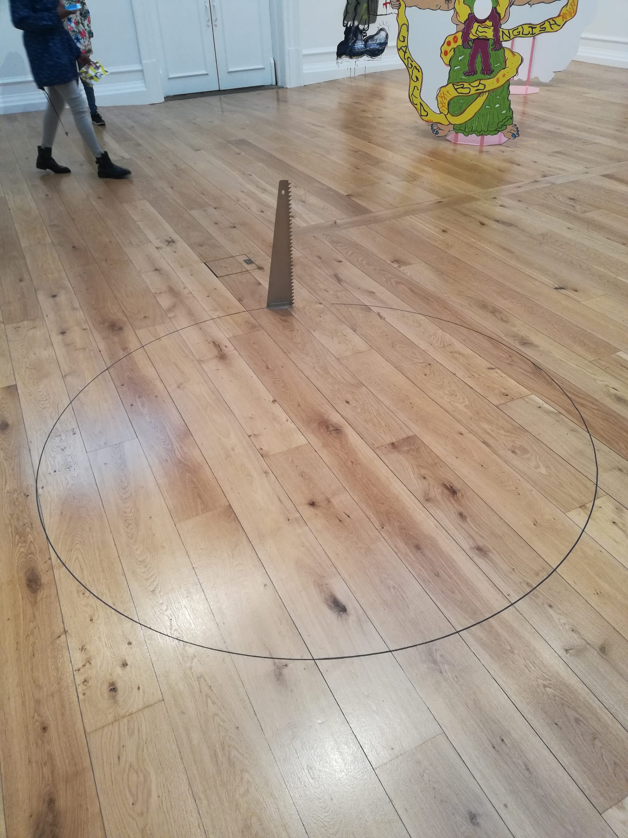 Ceal Foyer’s “Saw” (2015), meanwhile, takes the artists themselves to task. Emerging, in full “Tom and Jerry” style, from the floorboards, “Saw” is a clever, screwball nod to postminimal sculptors of the 1960s and 1970s monomaniacally intent on the circumscription of space. By cutting through the fabric of the gallery, albeit in an outlandishly cartoonish way, Foyer nods to this sculptural practice while questioning the value of many of its aims. It’s a work that elegantly, and devastatingly, brings Gordon Matta-Clark eye-to-eye with the Looney Toons.