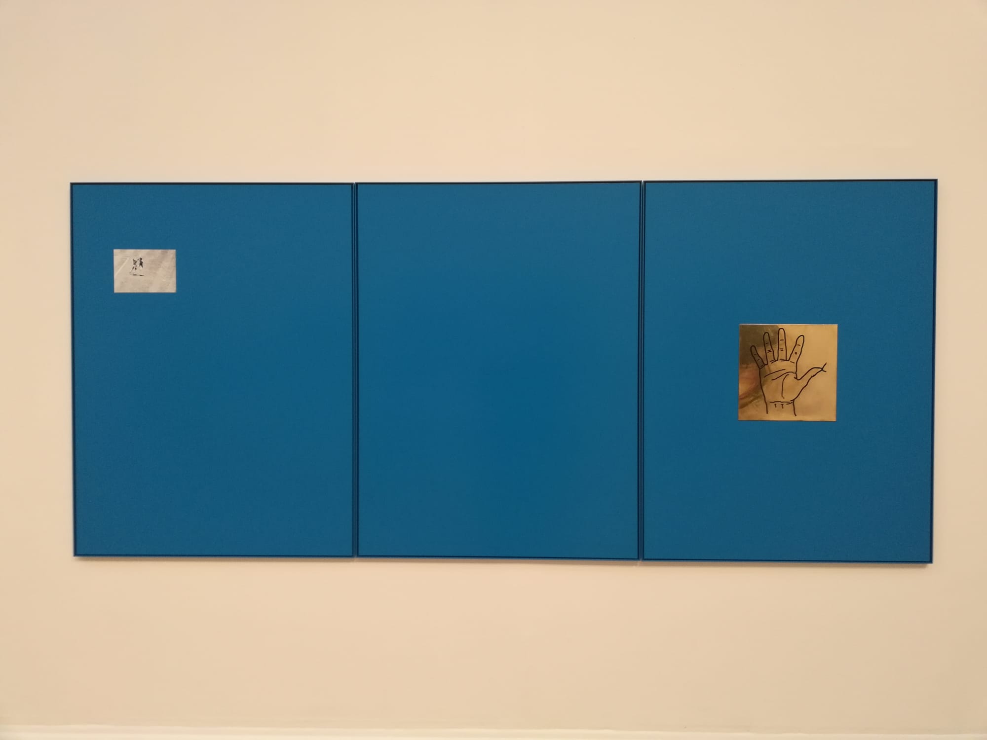 To their credit, curators Heller and Gander saw this criticism coming, and a few works point to this problem from within the exhibition’s framework. Simeon Barclay’s 2016 “Gatefold Series: I Wish I Knew Then What I Know Now,” is a rich example. A three-panel monochrome painting, redolent of certain minimalist works, plays host to two small inset images, a photograph of Maradonna’s “hand of god” goal in the 1986 world cup, and a diagram of the hand, showing precisely where the fateful ball hit. A hyper-attention to spatiality bridges the two worlds — minimalist panel and football controversy — but the contrast between popular culture and fine art discourse is made to feel too acute, an effect highlighted by the comical discrepancy in size between the panel and the images. As such, the possibility of “getting it,” of crossing over from one “field” to the other, ends up looking deliciously silly.