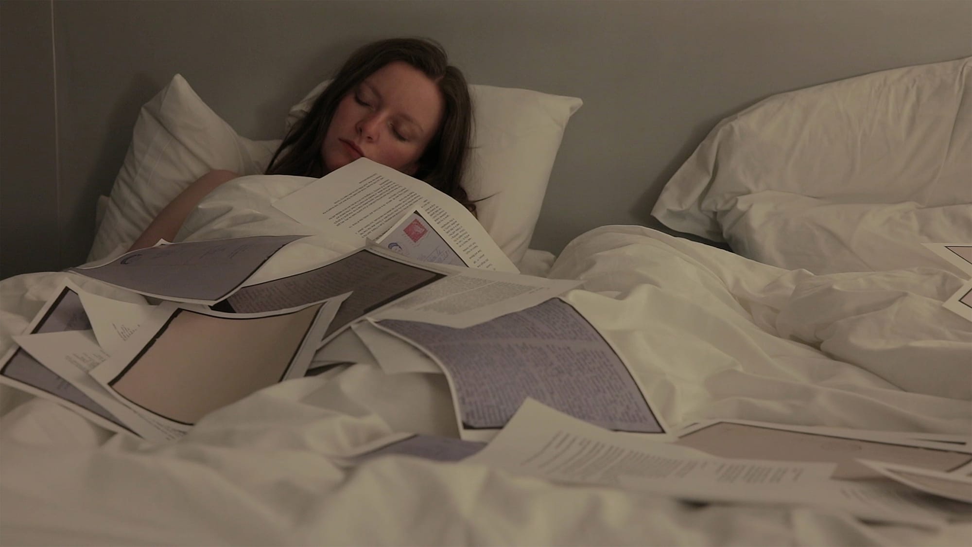 A similar blurring of fake and real is at play in the “autofictional” MS Slavic 7 (2019), by Canadian directors Sofia Bohdanowicz and Deragh Campbell. The film follows Audrey (a fictionalized version of Bohdanowicz, played by Campbell), who becomes completely absorbed in the real epistolary correspondence between her (Bohdanowicz’s) great-grandmother, the poet Zofia Bohdanowiczowa, and the Nobel-Prize-nominated author Józef Wittlin. Audrey decamps in a sterile hotel and makes regular pilgrimages to Harvard’s archives to study the box of letters (the title of the film is the box’s library call number).
