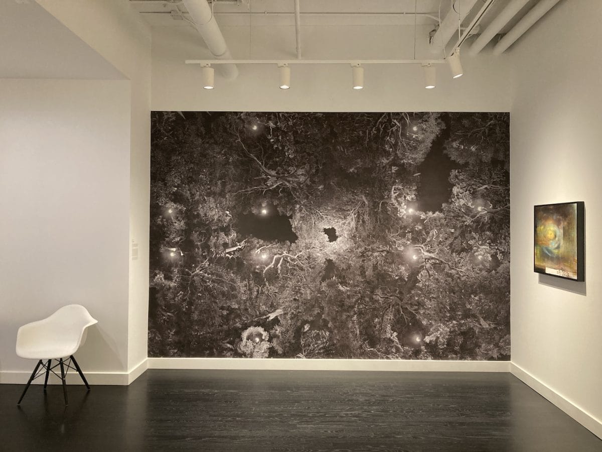 Other artists in Open on K are working on a scale just as large. “No 2 (from the Book of Miracles)” (2021) by Tanya Marcuse is a pigment print of a meticulous garden-bed diorama that the artist built by hand and then photographed from a scaffold. In fact, all of the gallery’s photographers swung big for the show. For “Up at Night” (2016–18/2021), Franz Jantzen stitched together 305 digital images of the sky-scape overhead, capturing and then carefully assembling a canopy of trees, stars, and moon in the darkness. The effect is stark and gorgeous. Colby Caldwell hauled a flatbed scanner into a forest to analyze a tree, resulting in “otff_(3/21)” (2021), a glitchy, painterly inkjet print.