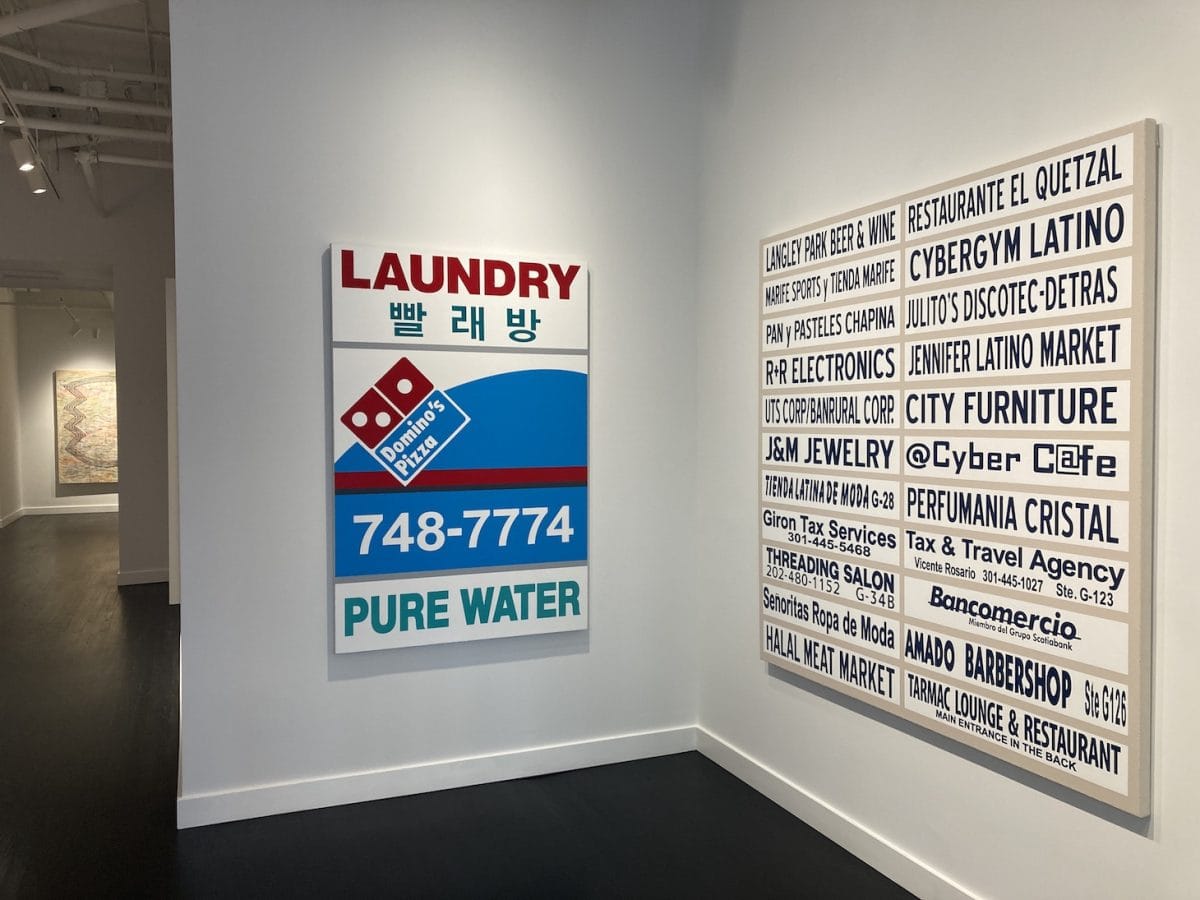 Then there’s painter and sculptor Renée Stout, who gives viewers just a glimpse of the sprawling, fantastical cosmos that she’s been building with “My Parallel Universe” (2016–20), a brooding image of swirling atmosphere and mysterious math. Three paintings from Mark Kelner’s Strip Mall Landscape series (2021) revisit more familiar geographies with fresh eyes. Kelner’s Pop-inspired paintings of strip mall signs showcase America’s growing and increasingly diverse suburbs without the typically dismissive stereotypes about suburbia.
