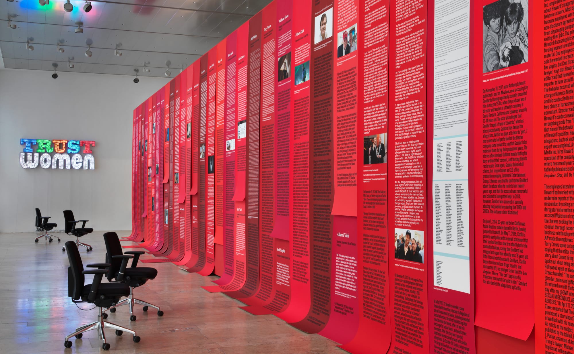 Andrea Bowers's installation Open Secrets details sexual assault allegations that have come to light in the wake of the #MeToo movement, but came under fire for using the likeness of a survivor after her assault, without permission.